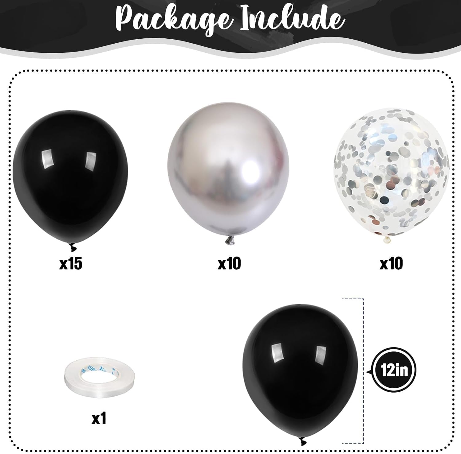 - š Premium & Durable Material - The black silver confetti balloon kit is made of high quality 100% natural latex, thick thick and long-lasting, not easy to burst, every balloon has been rigorously tested and selected manually, safe for children. They can be filled with air or helium, suggested use with a balloon pump.