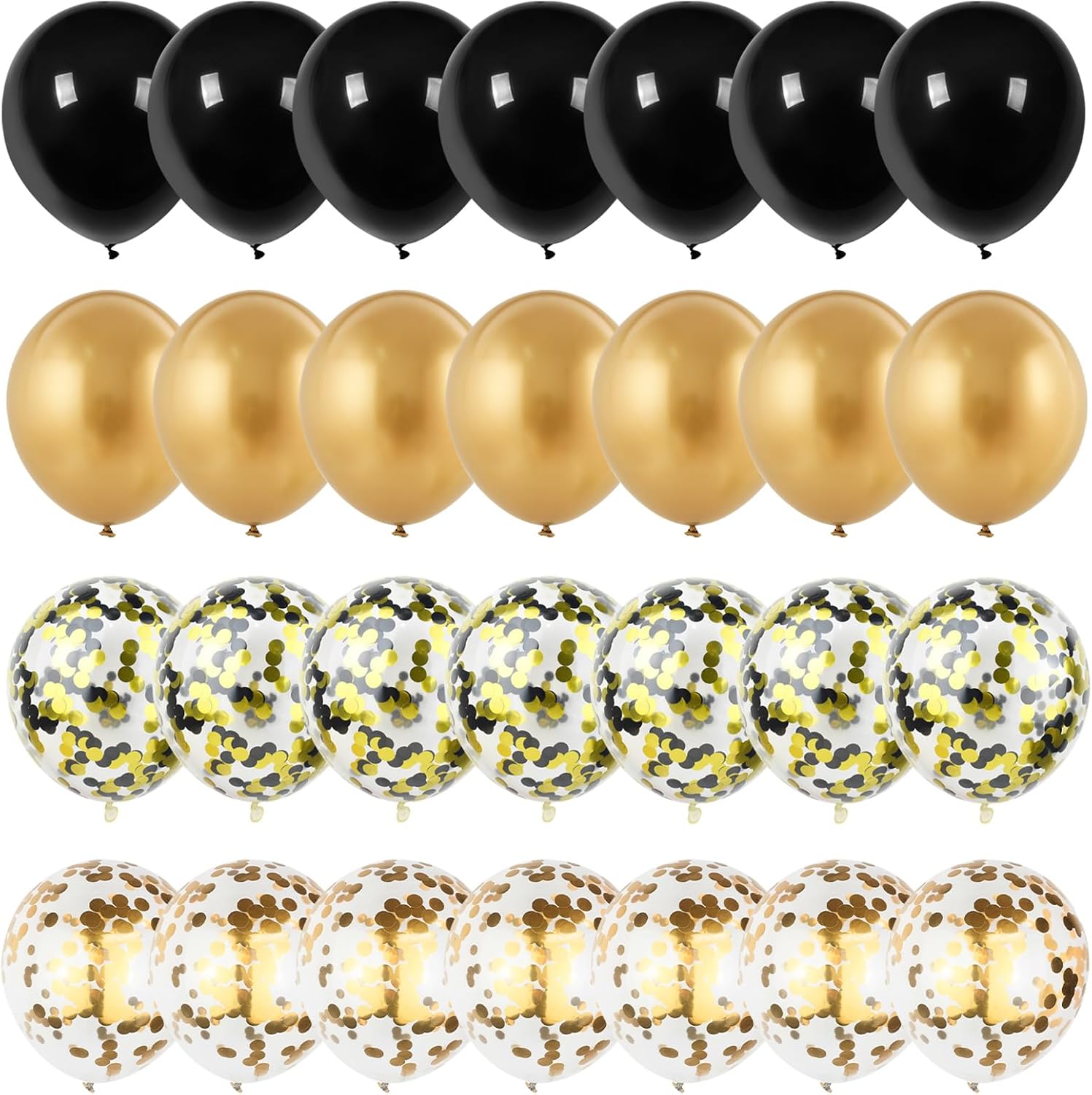 - š Black Gold Balloons - You will get 35 pieces 12 inch latex party balloons set, includes matte black 15pcs, metallic gold 12pcs, gold confetti 4pcs, black gold confetti 4pcs, come with 1pc gold balloon ribbon. Perfect for women men birthday baby bridal shower wedding new year party decorations supplies.