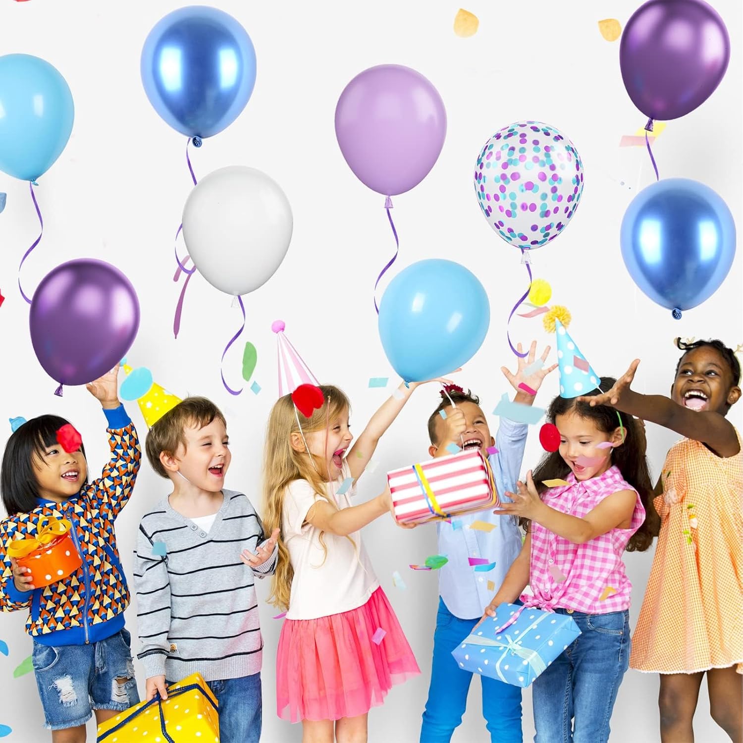 - 50pcs 12 inch Blue Purple Balloons: Package content includes 6 pcs metallic purple balloons, 11 pcs purple balloons,6 pcs metallic blue balloons, 6 pcs confetti purple blue balloons,10 pcs white balloons,11 pcs blue balloons,a balloon ribbon