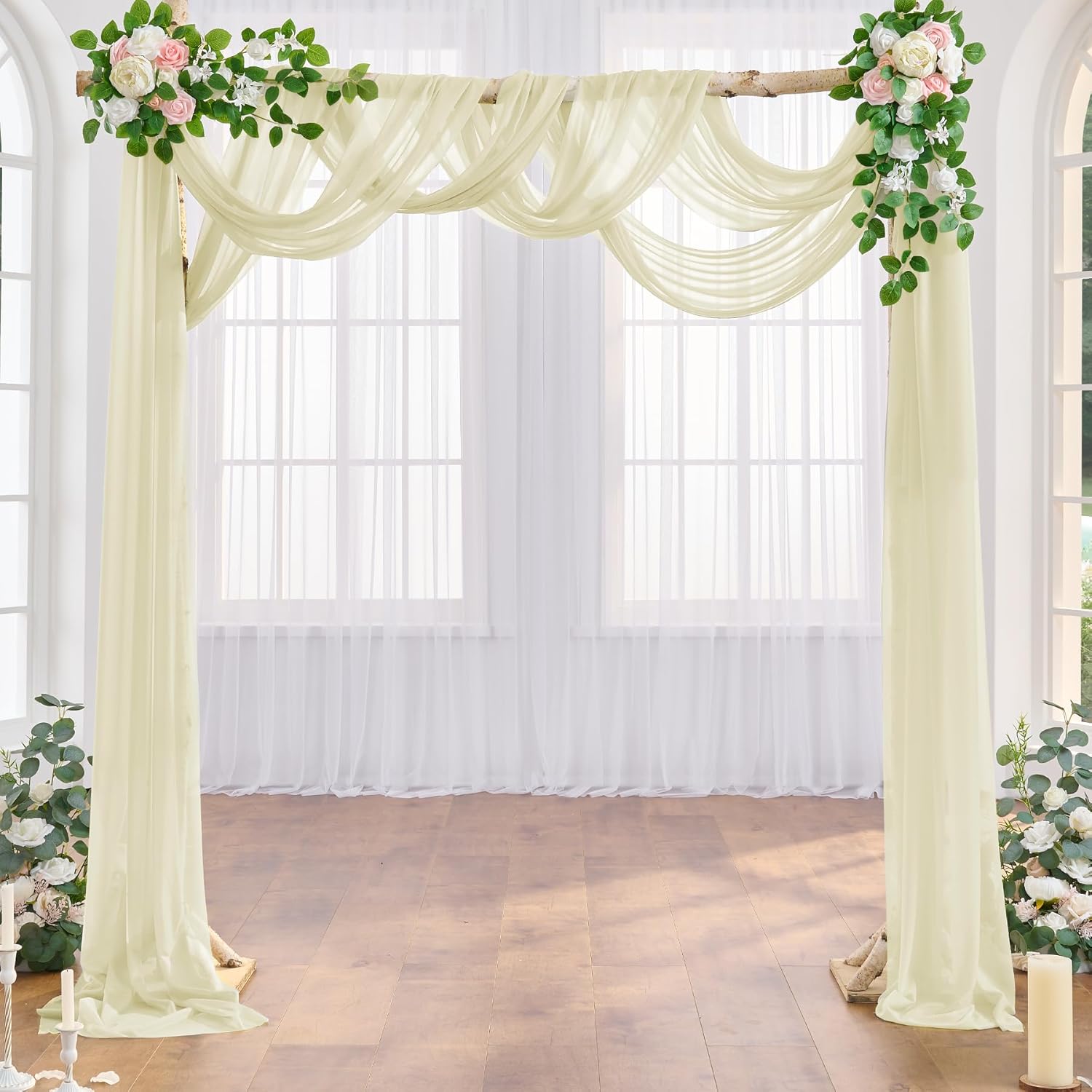 - Elegant Beige Wedding Arch Draping Fabric:Create a warm and romantic backdrop with our elegant Beige wedding arch fabric. This beautiful sheer drape resists wrinkles, allowing you to effortlessly create delicate curves or flowing folds for a picture-perfect ceremony. The versatile beige tone adds a touch of soft, neutral warmth to your arch, arbor, or canopy decor.