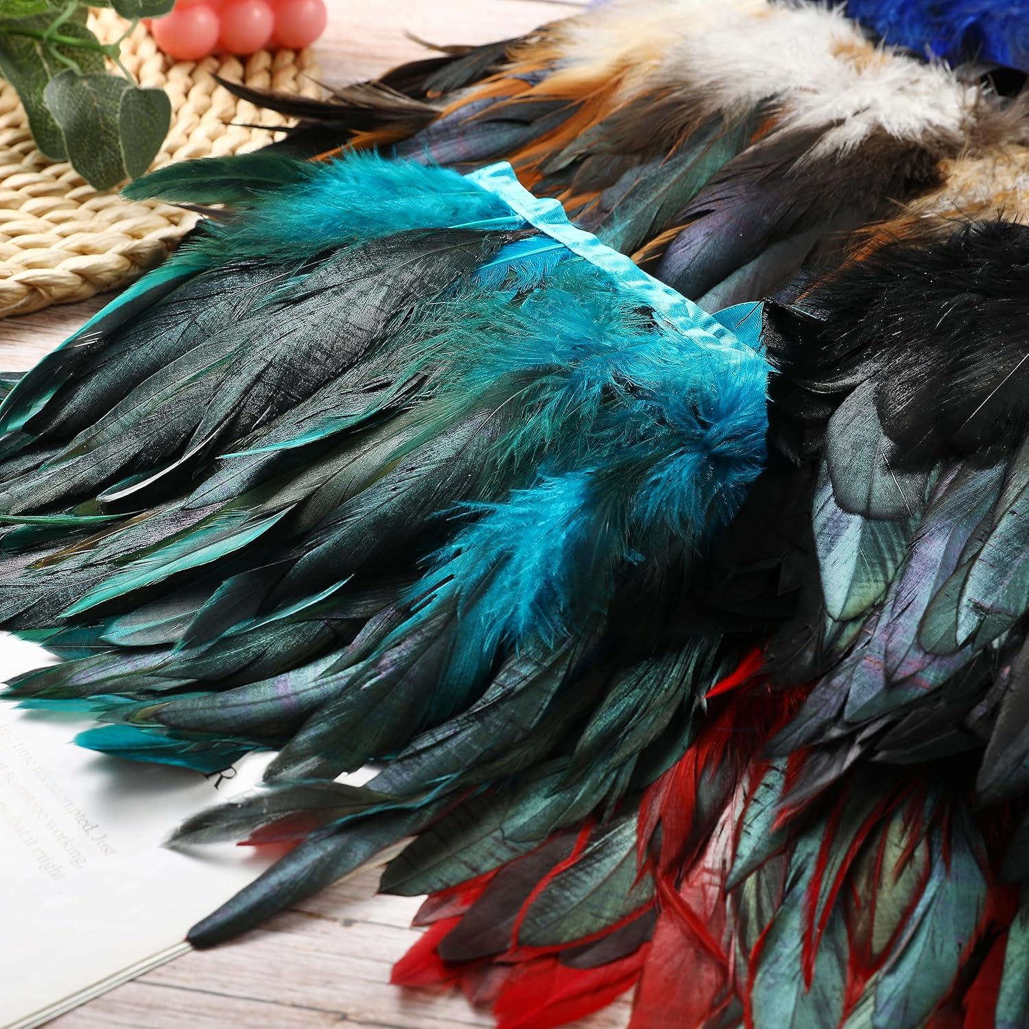 - Easy to Cut and Sew: Each rooster feather trim is 2 yards long and 5-7 inches wide.This rooster feather decoration is sewn with dyed rooster tail feathers and ribbons, it can be cut and sewn to size, suitable for any DIY feather handicraft, such as skirt, gloves, hats, masks, vases, wings, wreaths, etc