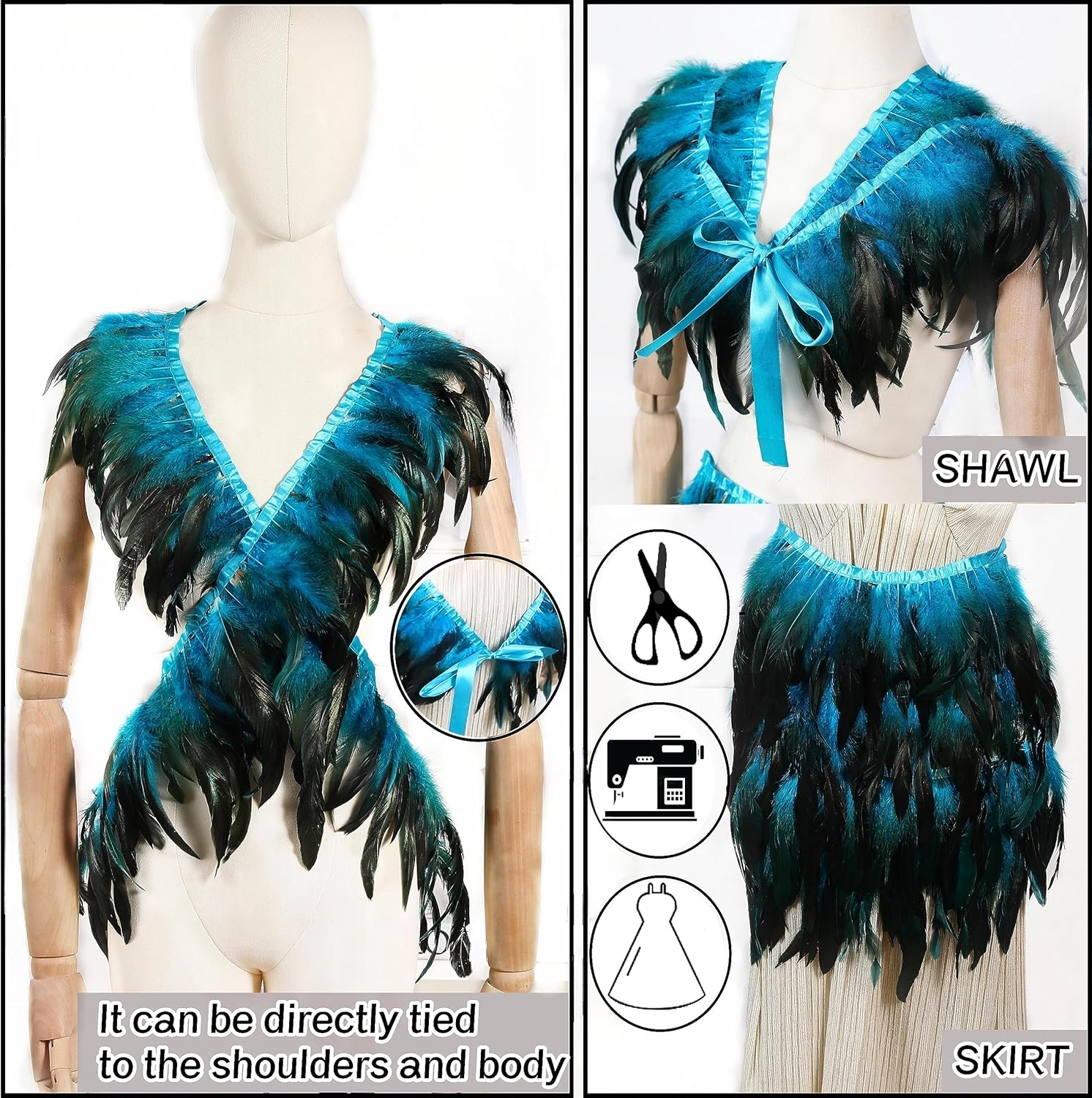 - Unique Feather Shawl: Each feather trim has an additional 15 inch ribbon at both ends that can be tied directly to the shoulders and body to create a shawl. The unique design sets you apart from the crowd, ideal for carnival party to complement chic outfits