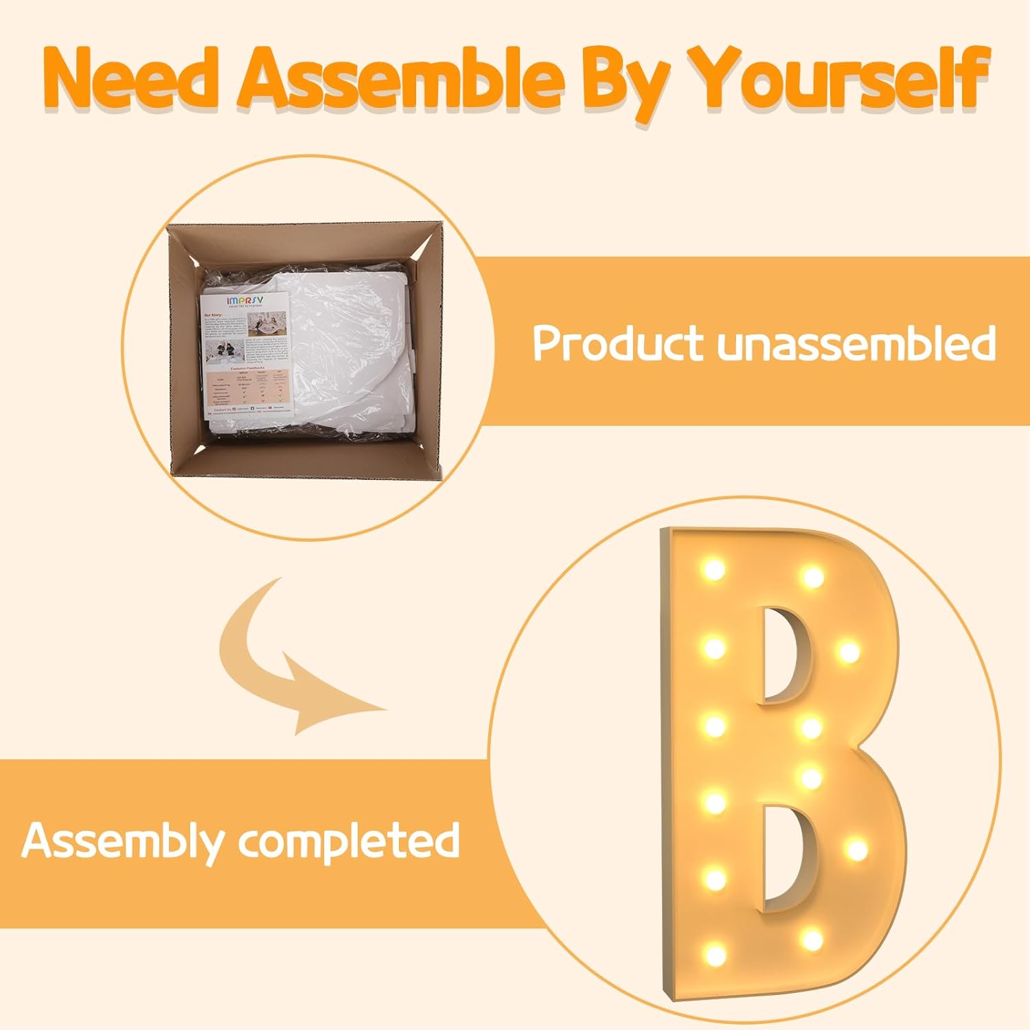 - Assembly Required: Our large marquee letters is made from foam board and easy to assemble with our splicing mode. Just follow the numbered instructions to align and insert the bottom plate, and reinforce it with a hot glue gun. Then, you're done!