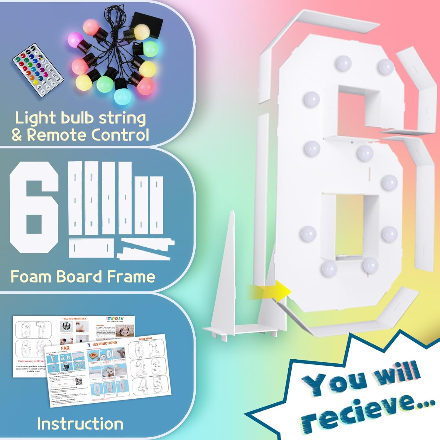 imprsv 4FT Colorful Marquee Numbers,18 Colors Number 6 with Remote, Light Up Numbers Sign for 60th Birthday Decorations Anniversary Party Decor, Pre-Cut Foam Board Kit, Mosaic Sign for Balloon