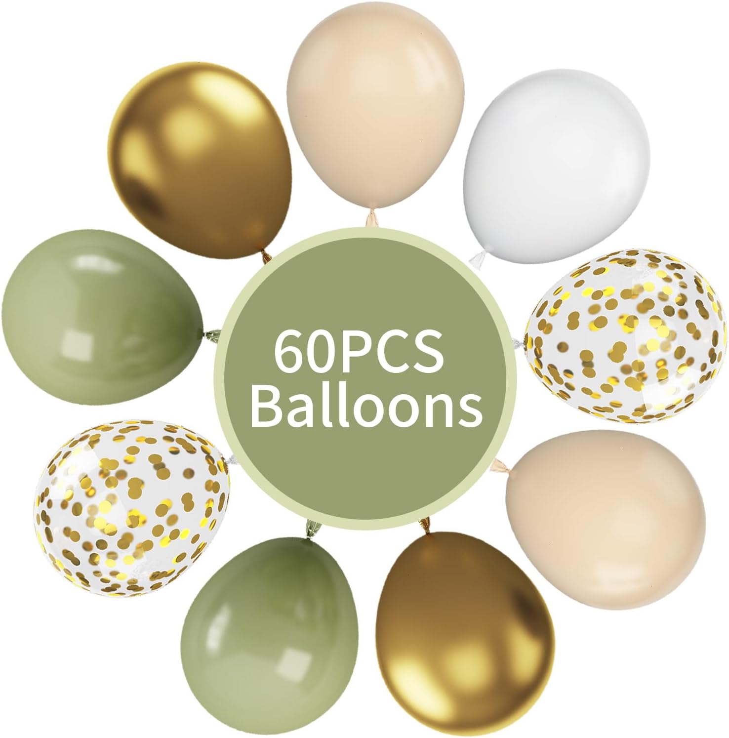 - Package Included : Our sage green balloons set includes 60 pcs 12 inch latex balloons. 23 pcs sage green balloons, 22 pcs white balloons, 6 pcs gold balloons, 4 pcs apricot+white double balloons, 5 pcs gold confetti balloons and 2 pcs white ribbons