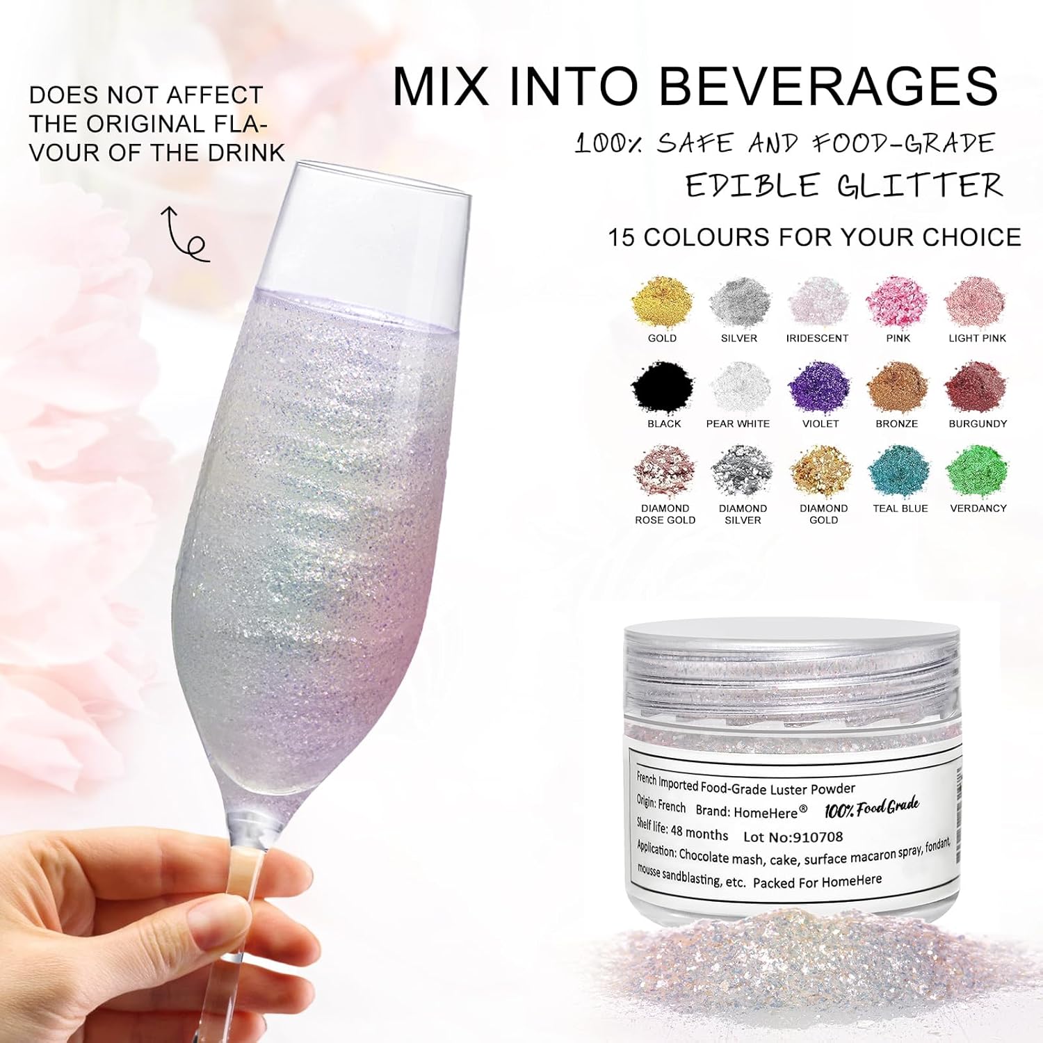 - TASTELESS GLITTER DUST: Our edible iridescent dust is tasteless and adds a gorgeous shine to your baking or DIY drinks, with a wide range of colors to choose from. Perfect for festive events such as parties, family dinners, and social gatherings. Experience the fun and simplicity of using food-grade glitter with your favorite beverages & food!