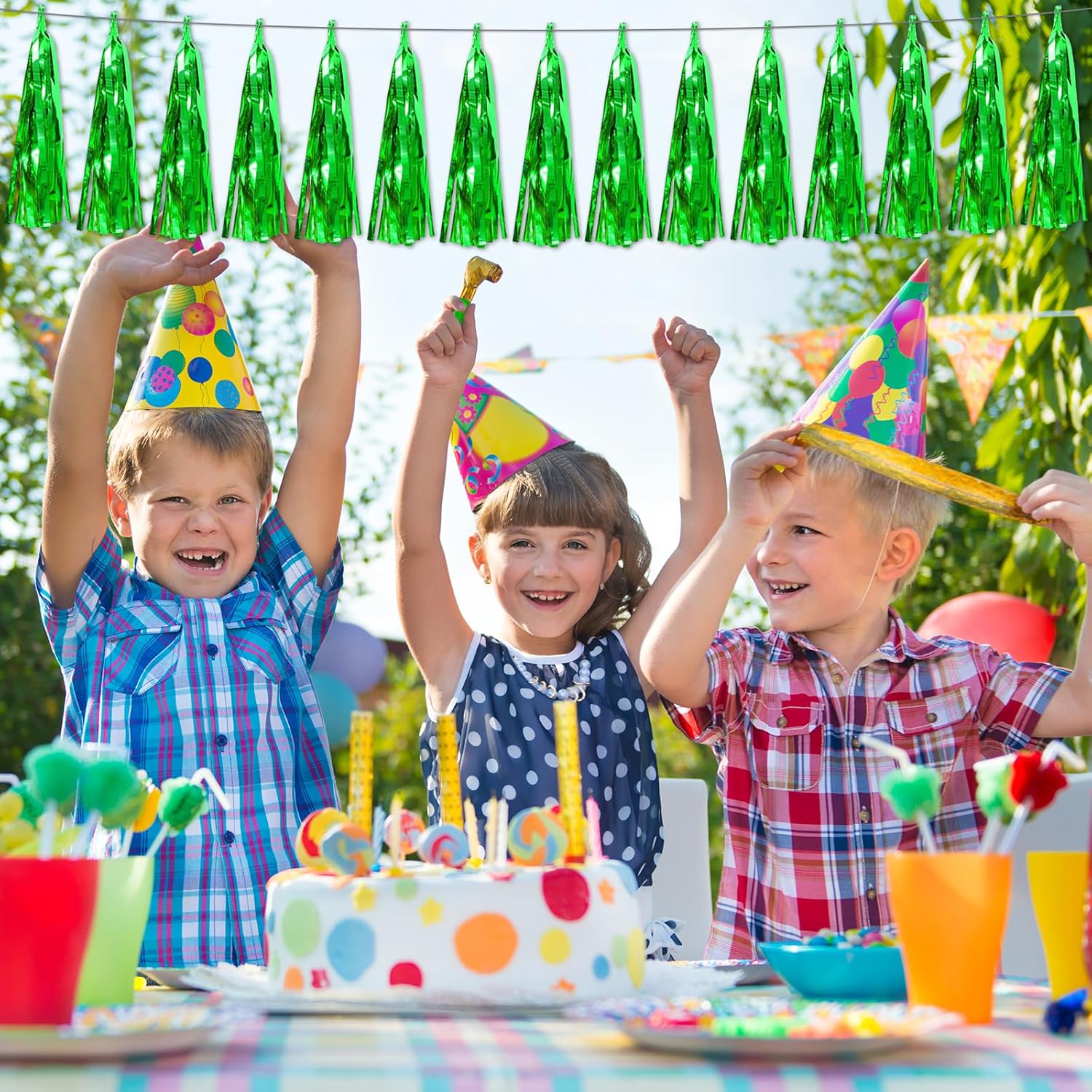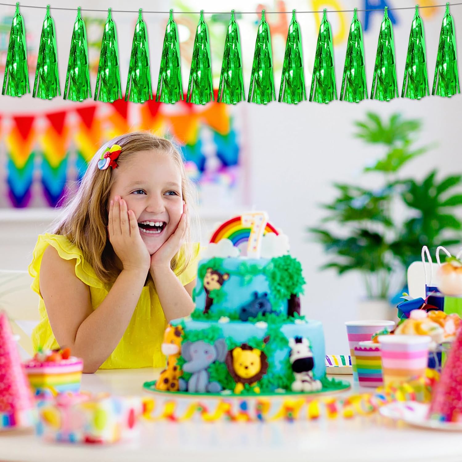 - 【Green Party Supplies Set】: The total length of the green birthday tassels banner is 59 feet, divided into 6 strips, each 9.8 feet long. Each banner contains 15 tassels, and each tassel measures 14 inches, for birthday decorations many occasions, and so on