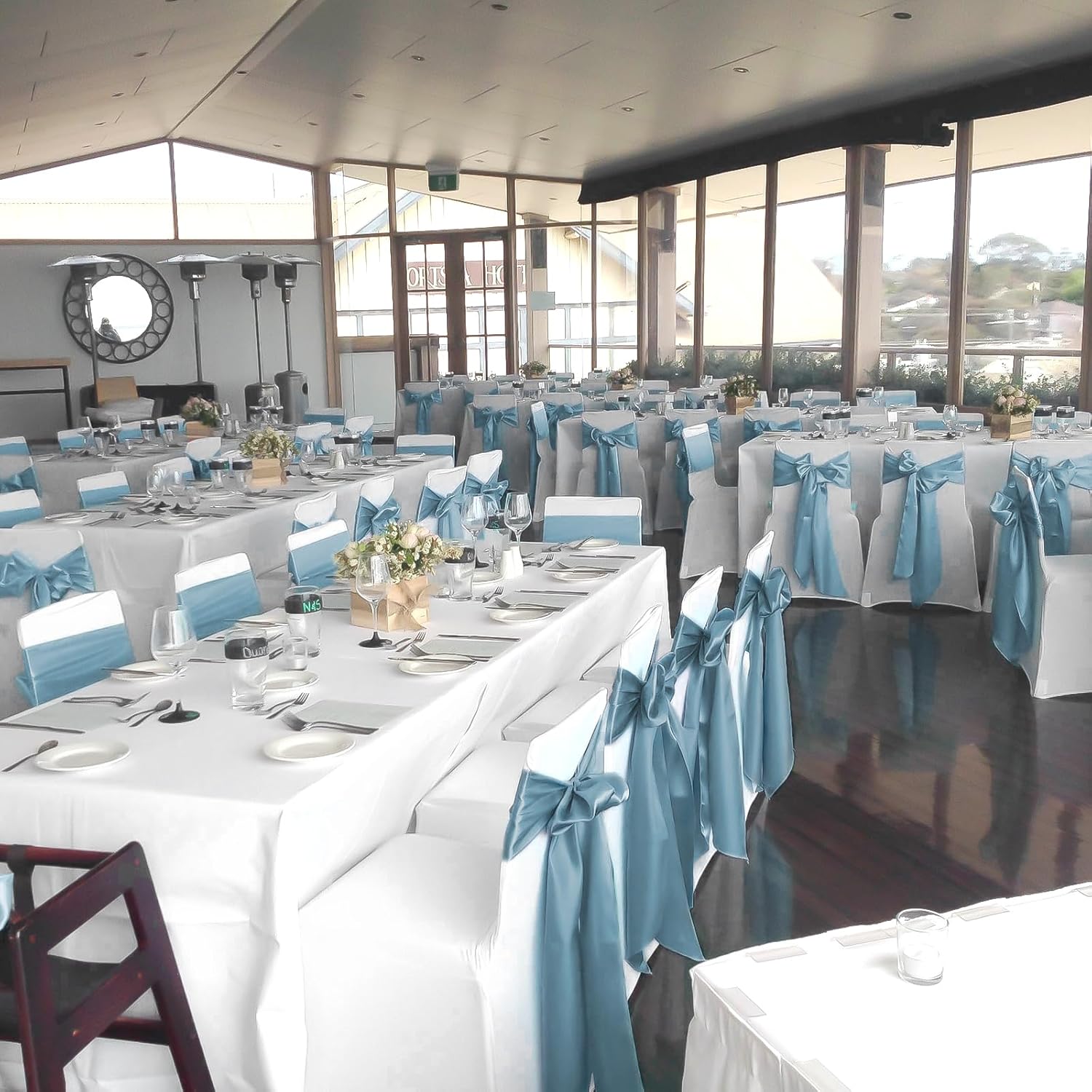 fani 60 PCS Dusty Blue Satin Chair Sashes Bows Universal Chair Cover for Wedding Reception Restaurant Event Decoration Banquet,Party,Hotel Event Decorations (7 x 108 inch)