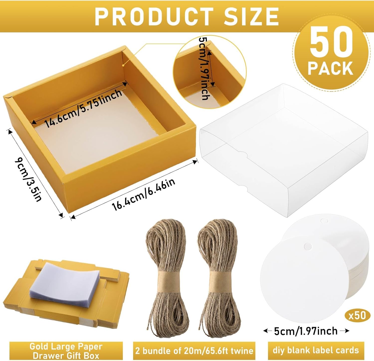 Roowest 50 Sets Kraft Soap Boxes Rectangle Packaging Box with Window Homemade Gift Box with Blank Tags and Jute String for Jewelry Candy Wrapping Party Favor(6.5 x 6.5 x 2 Inch,Gold)