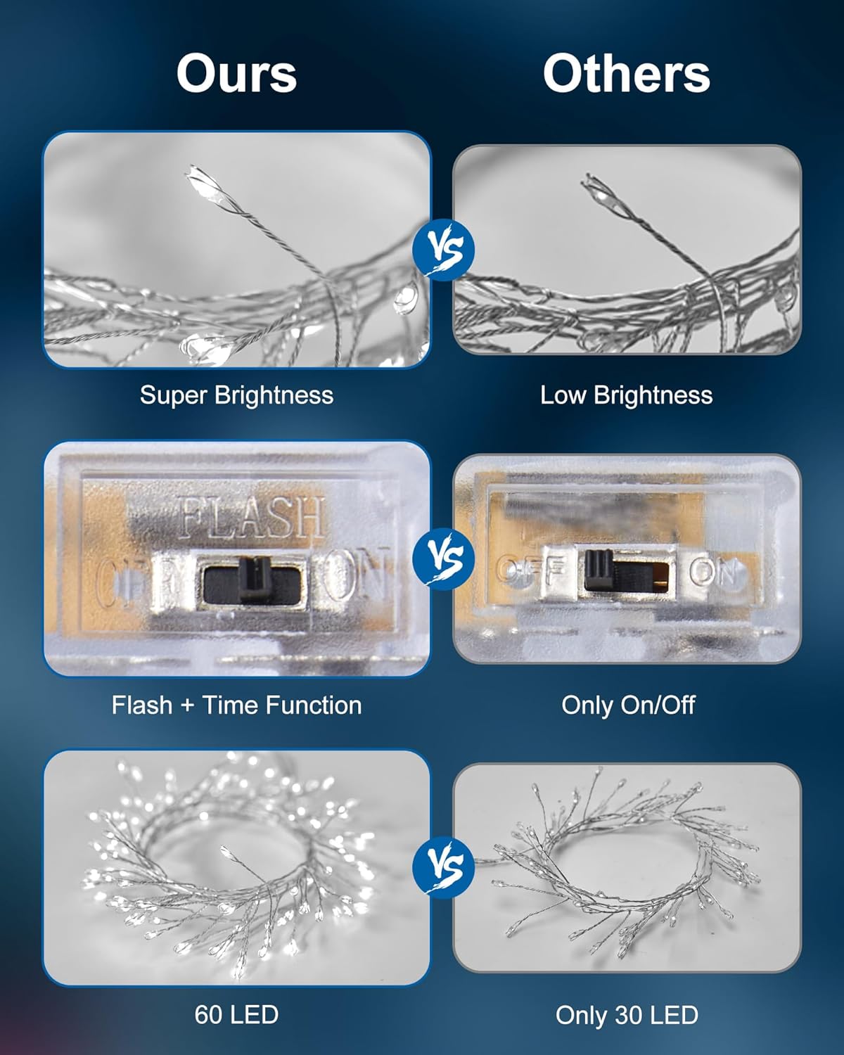 - Brighter Lights: 5 feet 3 x AA battery operated twinkling firecracker cluster lights, the luminous miniature LED light looks like a drop of light attached to a shiny wire, with steady 360 degree viewing angle they illuminate in every direction