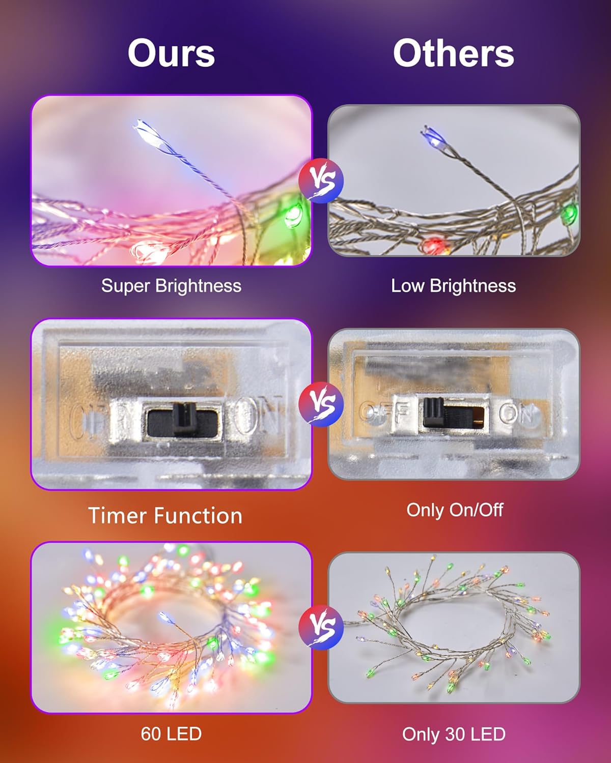 - Brighter Lights: 5 feet 3 x AA battery operated twinkling firecracker cluster lights, the luminous miniature LED light looks like a drop of light attached to a shiny wire, with steady 360 degree viewing angle they illuminate in every direction