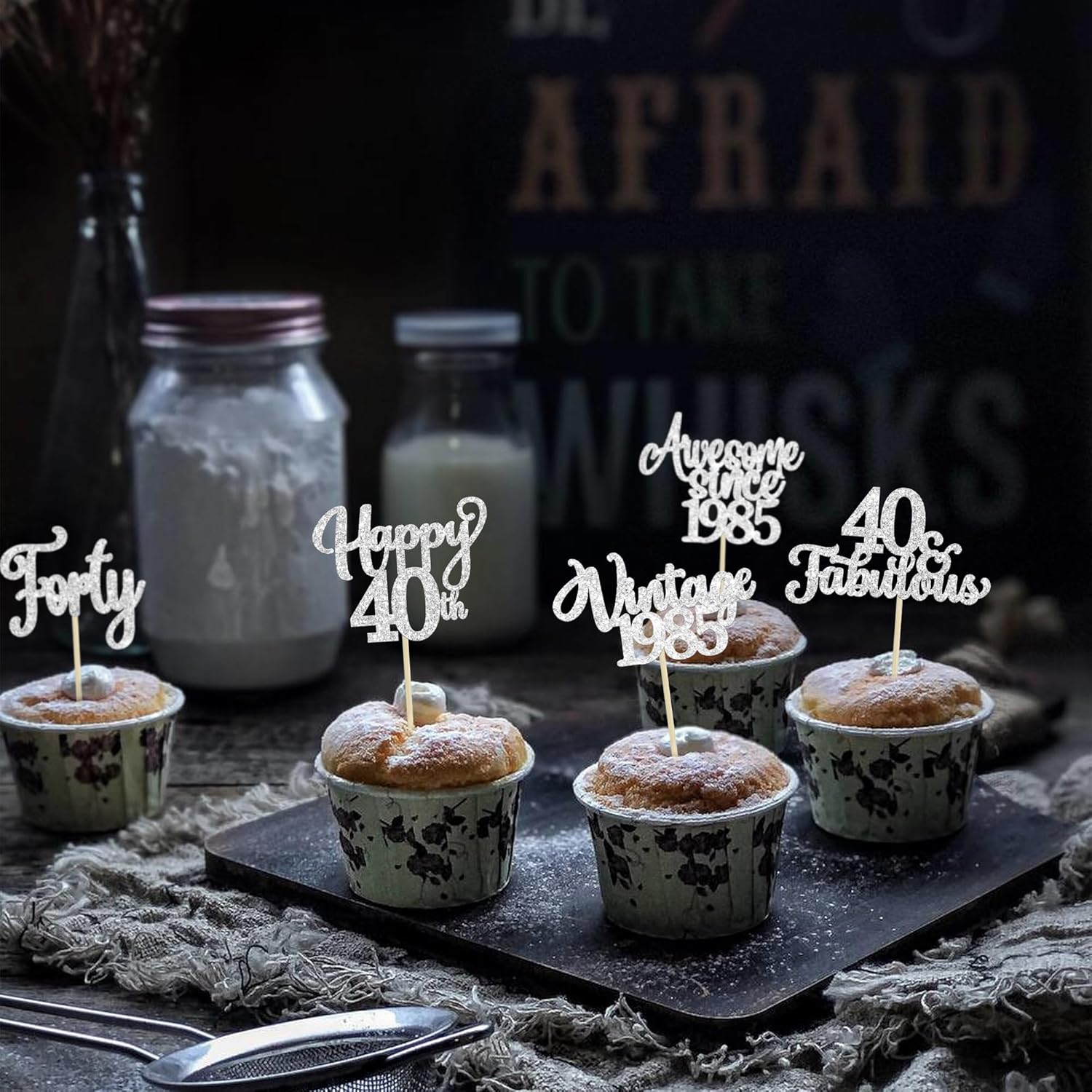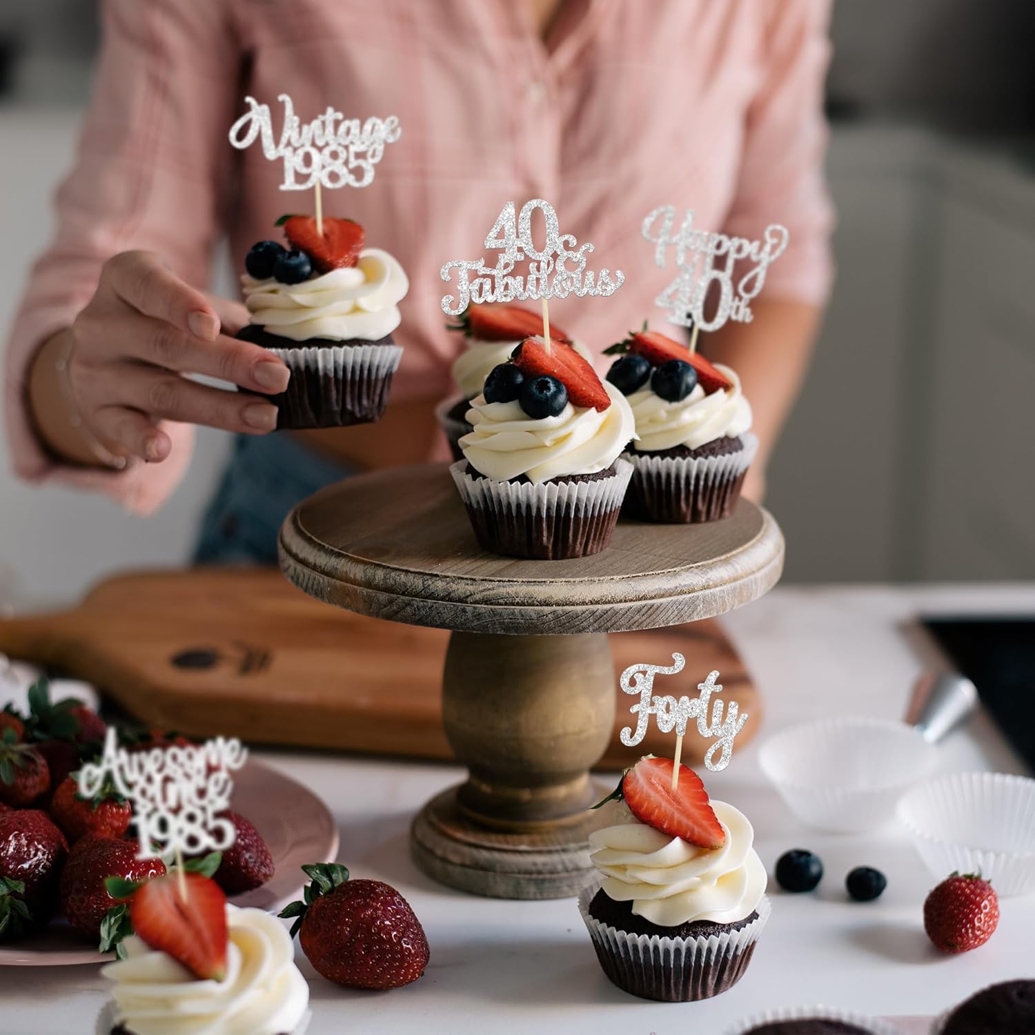 30Pcs Happy 40th Birthday Cupcake Toppers Glitter Forty Vintage 1985 Cupcake Picks Cheers to 40 Fabulous Cake Decorations for 40th Birthday Wedding Anniversary Party Supplies Silver
