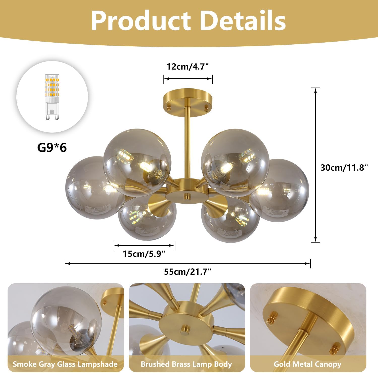 - Perfect for Low Ceilings & Easy Installation: 6-lights glass globe sputnik chandelier ceiling light removing the cumbersome design, semi flush mount can be easily embedded on most occasions, perfect fit with any ceilings, from high ceilings to low ceilings. The installation is super easy, just loosen the lock ring and finish lamp body installation, then rotate the glass globe to finish the lampshade installation