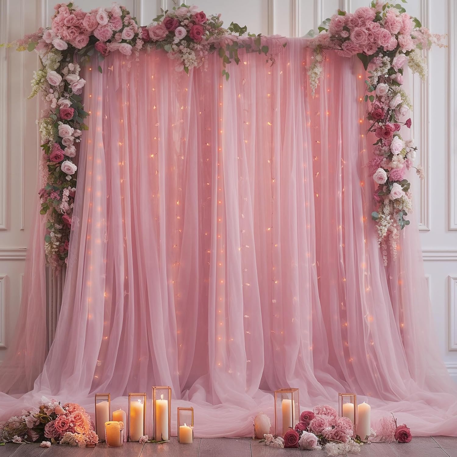 - 【Elegant Sheer Draping Fabric】Our dusty rose backdrop curtain are crafted from high-quality delicate soft and smooth tulle.The fabric is so dreamy. It's like a semi sheer dress that flows in the wind, so romantic. And it's also lightweight to wear, the wind was able to blow it for a dramatic effect.