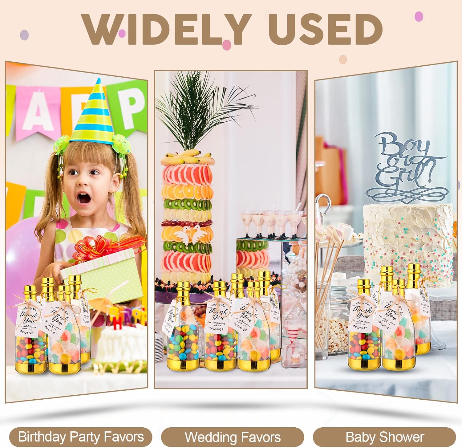 - Variety of Occasions: these clear plastic party favor containers will become exquisite souvenirs for your guests after parties, and you can use these mini champagne bottles to store different kinds of candies for your guests to enjoy, which are nice for bridal shower, wedding, birthday, baby shower and more meaningful activities