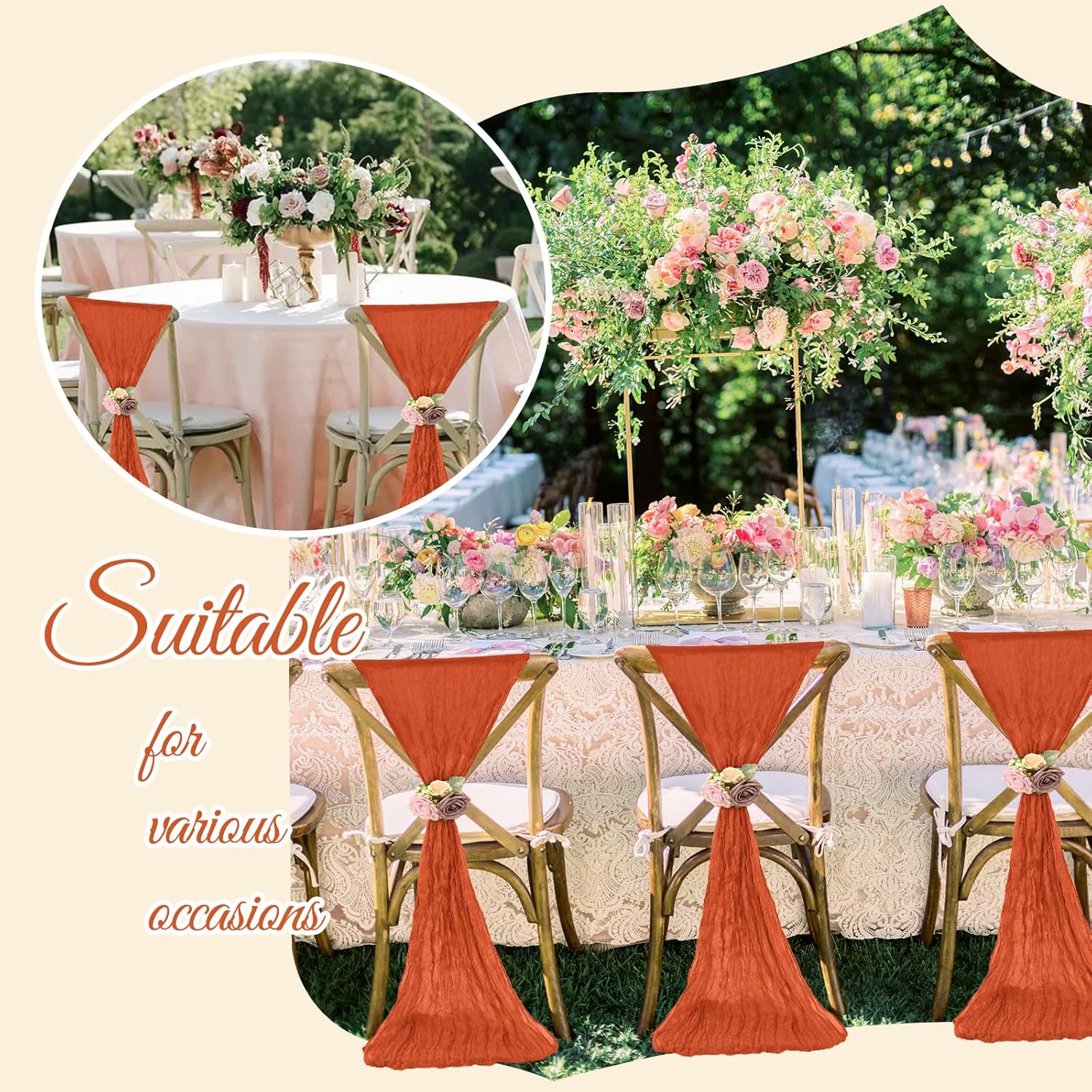 - 【Wide Application】Cheesecloth chair sashes have a romantic and elegant boho style, suitable for wedding, birthday parties, family gathering, baby showers, banquets, Christmas, Thanksgiving Day and other special occasions.It is also a necessary decorative item for restaurants, auditoriums, activity centers, hotels, and other places.