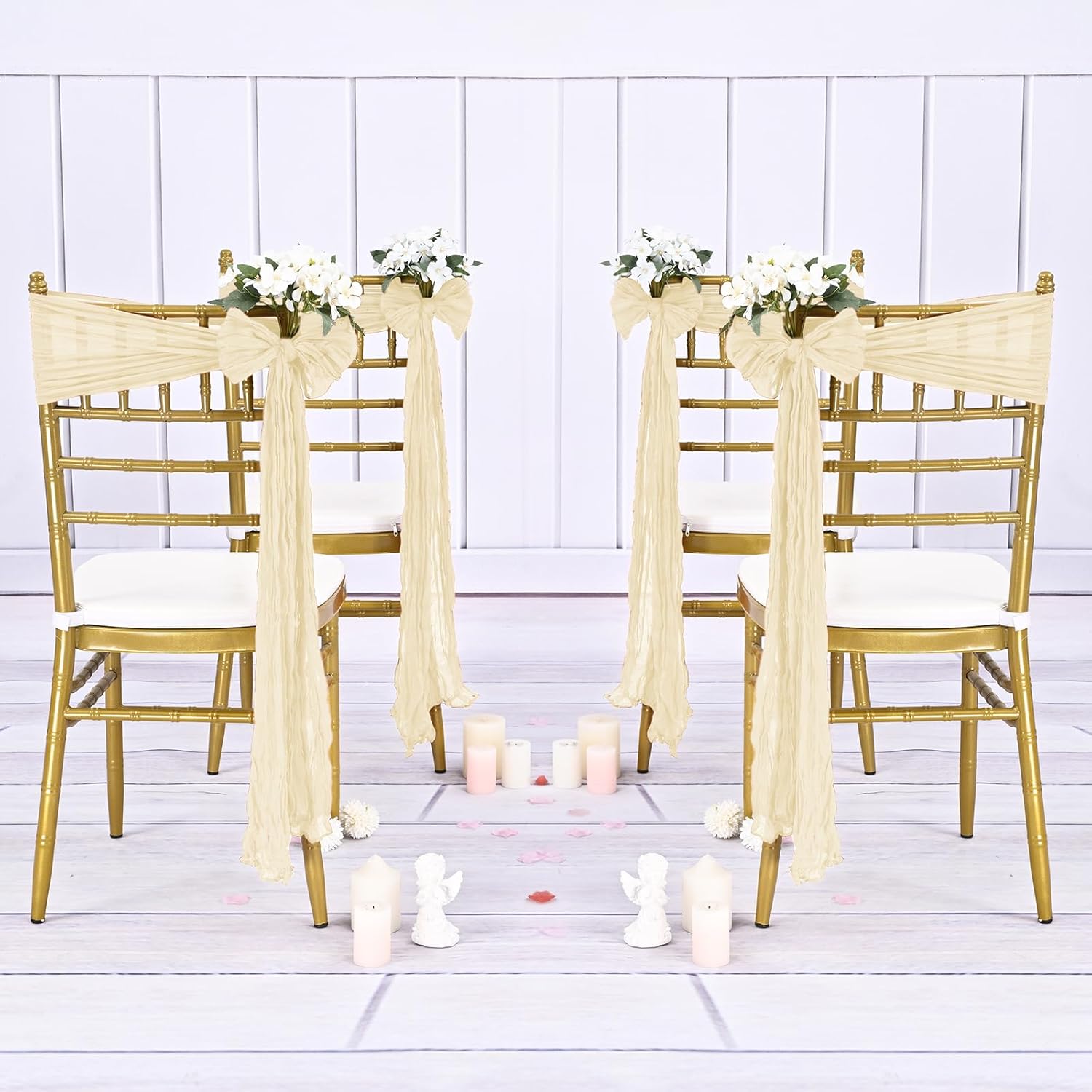 - 【Wide Application】Cheesecloth chair sashes have a romantic and elegant boho style, suitable for wedding, birthday parties, family gathering, baby showers, banquets, Christmas, Thanksgiving Day and other special occasions.It is also a necessary decorative item for restaurants, auditoriums, activity centers, hotels, and other places.
