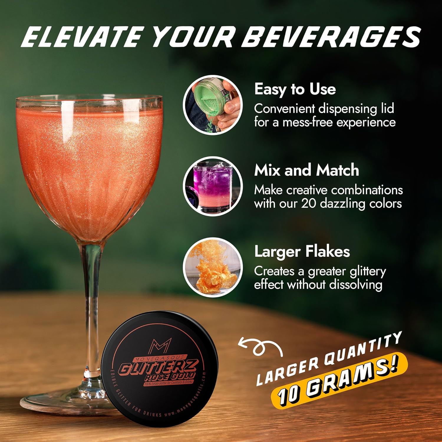 - PREMIUM EDIBLE GLITTER FOR COCKTAILS – Add a touch of glamour to your creations with MONÉGASQUE Glitterz. Perfect for cocktails, cakes, and more, our halloween glitter is flavorless and safe, crafted from mica-based pearlescent and food-grade colorants.