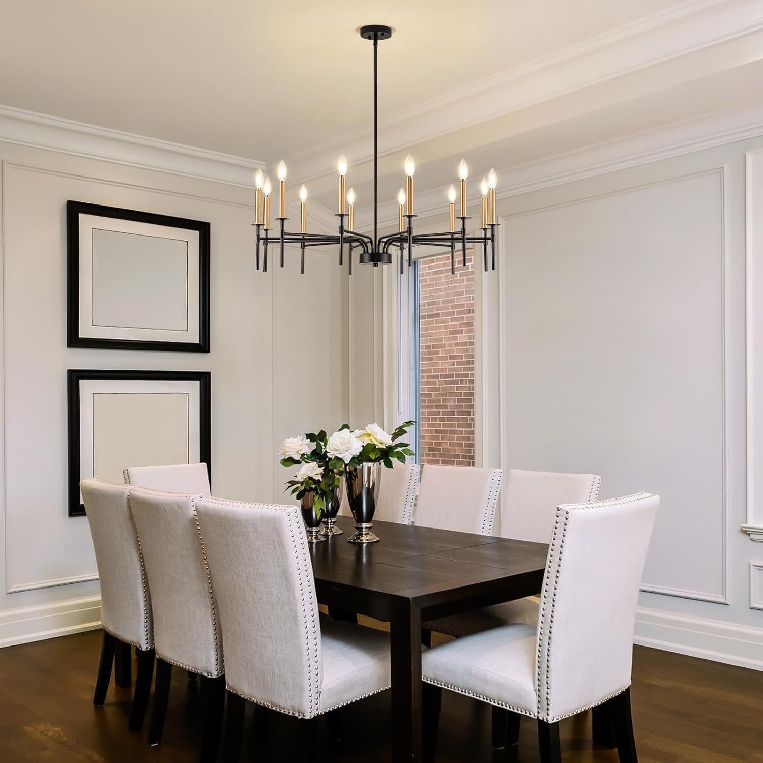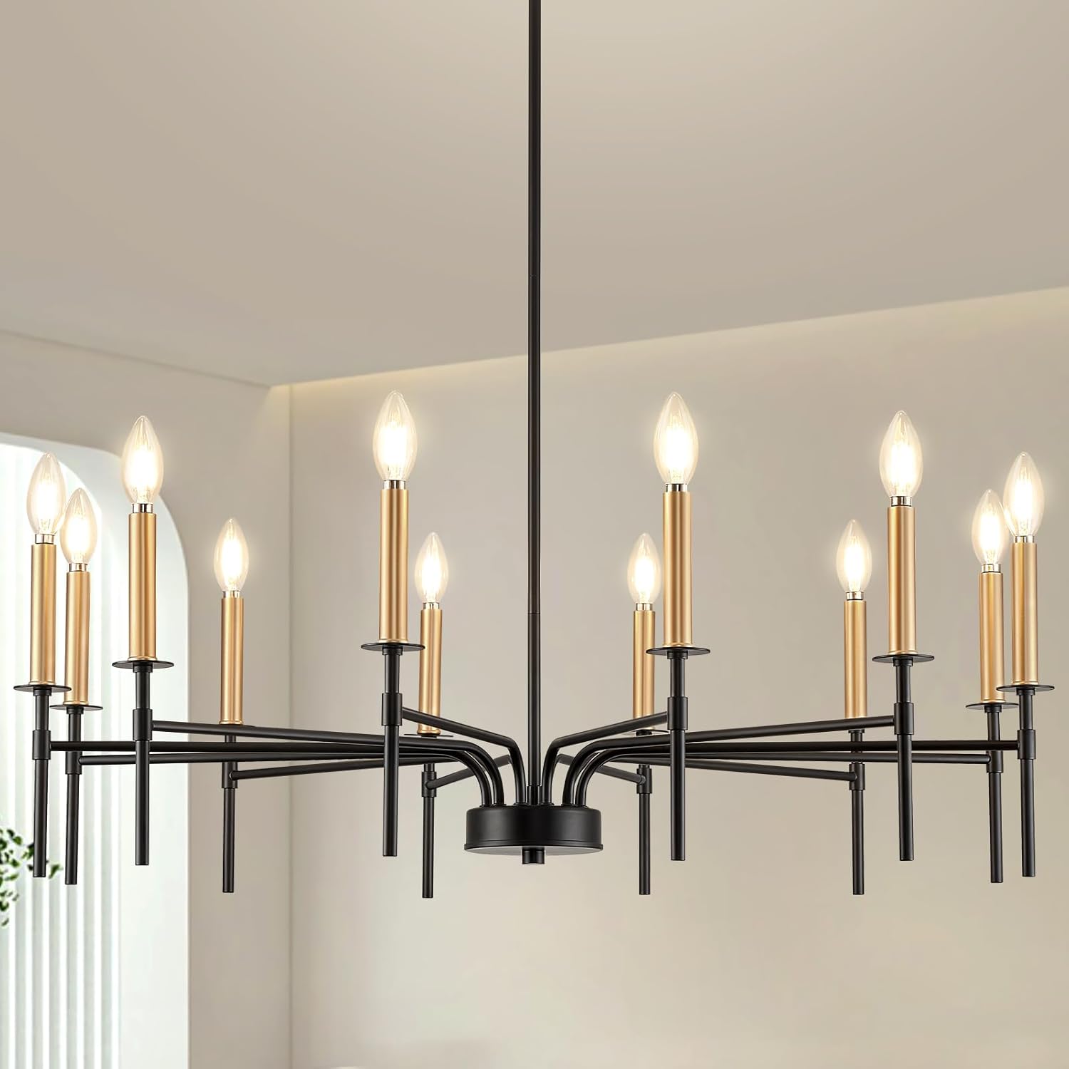 12 Light Modern Farmhouse Black and Gold Chandeliers for Dining Room Light Fixture, Metal Candle Chandelier Lighting Fixtures for Living Room Stair Foyer Entryway Bedroom Kitchen
