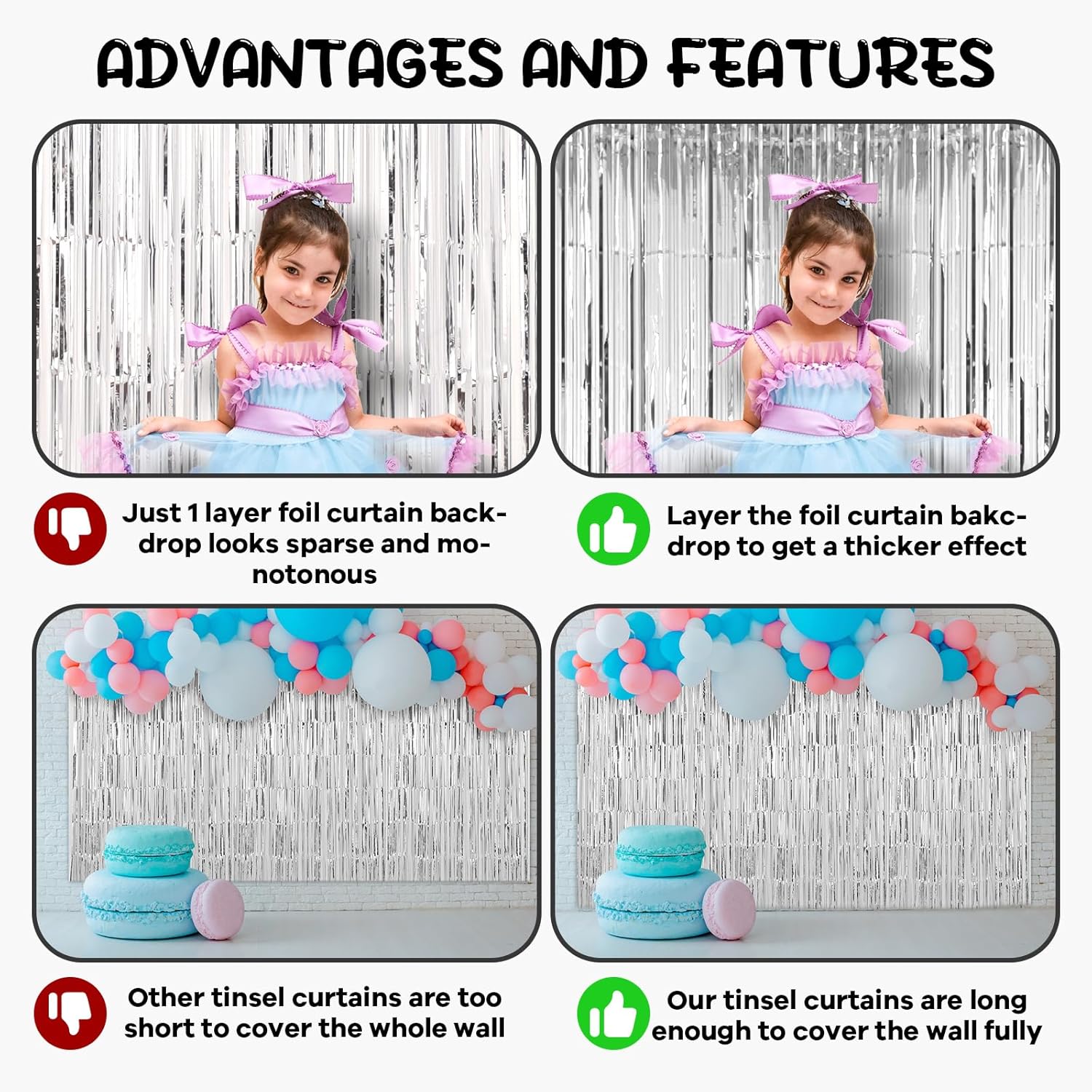 • Eye-Catching Design: These tinsel backdrops boast vibrant colors and a shimmering effect that reflects light beautifully. Your friends will be mesmerized by the captivating atmosphere these curtains create