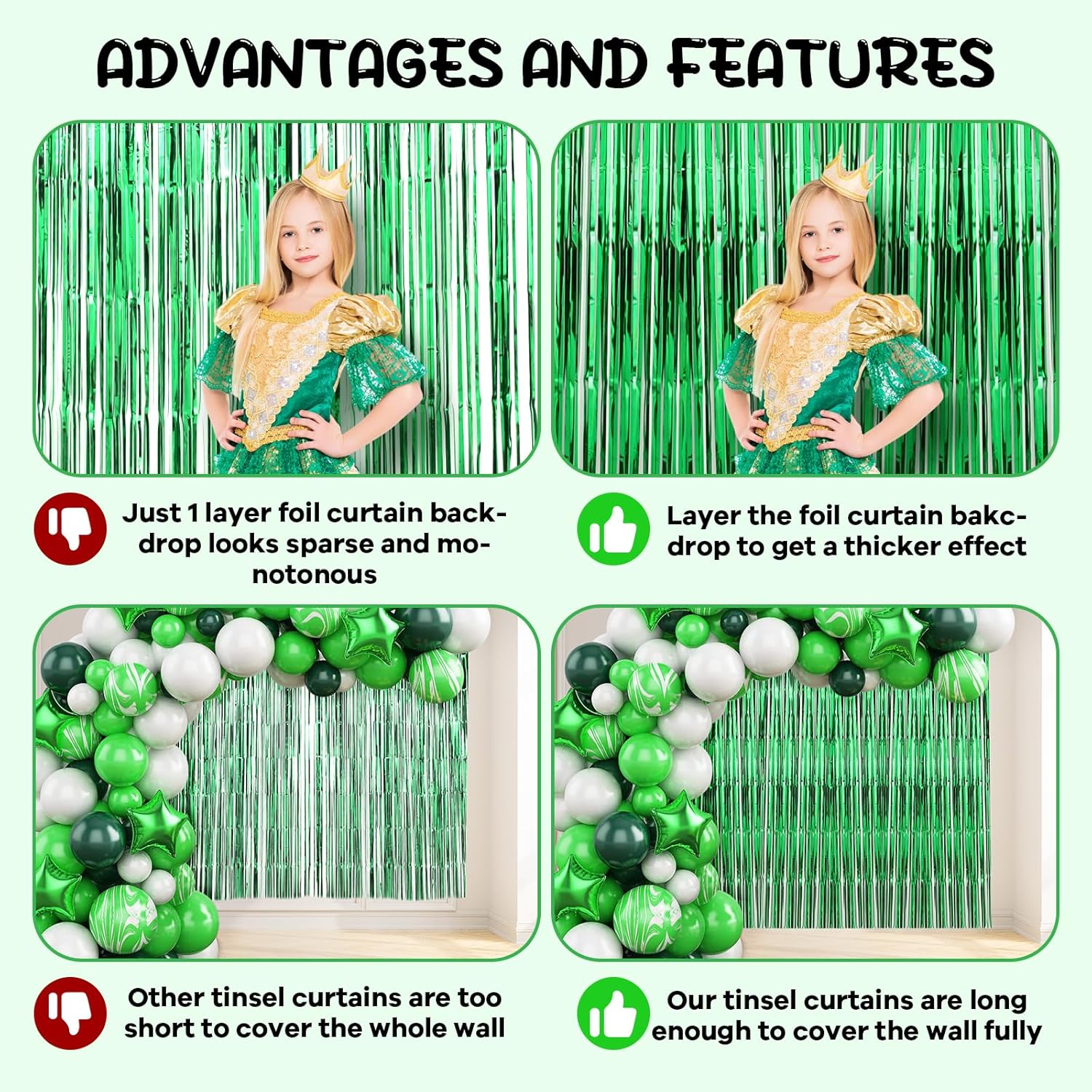 - Premium Material: This green foil curtain backdrop is made of stable tinsel, non-fading, stay shiny and reusable. Unfold it and then enjoy your glittering party