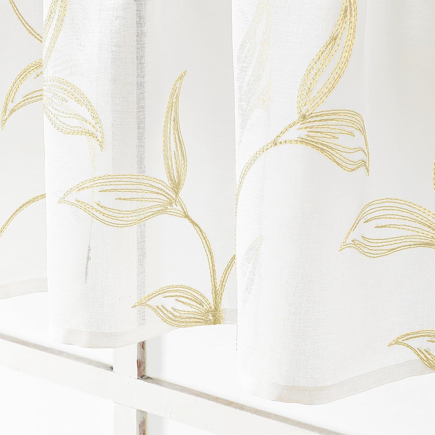 VISIONTEX White Sheer Voile Curtains, Decorative Leaves Embroidery Faux Linen Rod Pocket Window Drapes for Home Kitchen, Living Room and Bedroom 26 x 36 Inch, Set of 2 Curtain Panels