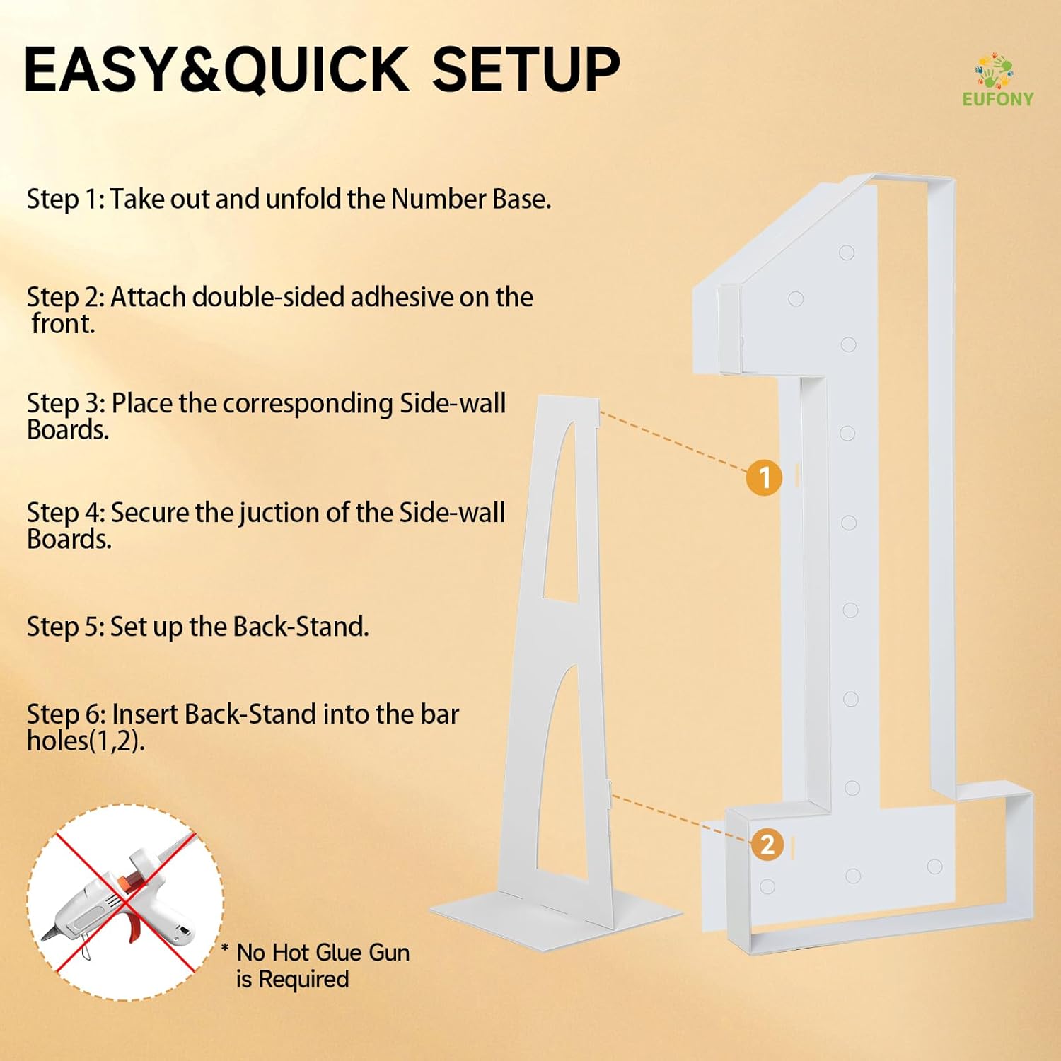 - 【Assembly Needed】Crafted from pre-cut FOAM BOARD with guiding edge marks, our large marquee numbers ensure easy, precise assembly. Simply apply double-sided tape to the base surface (not the sides) and attach the side walls. NOTE: Our lighted numbers assembly process differs from other brands. Be sure to watch our included step-by-step instructions or tutorial videos for best results.