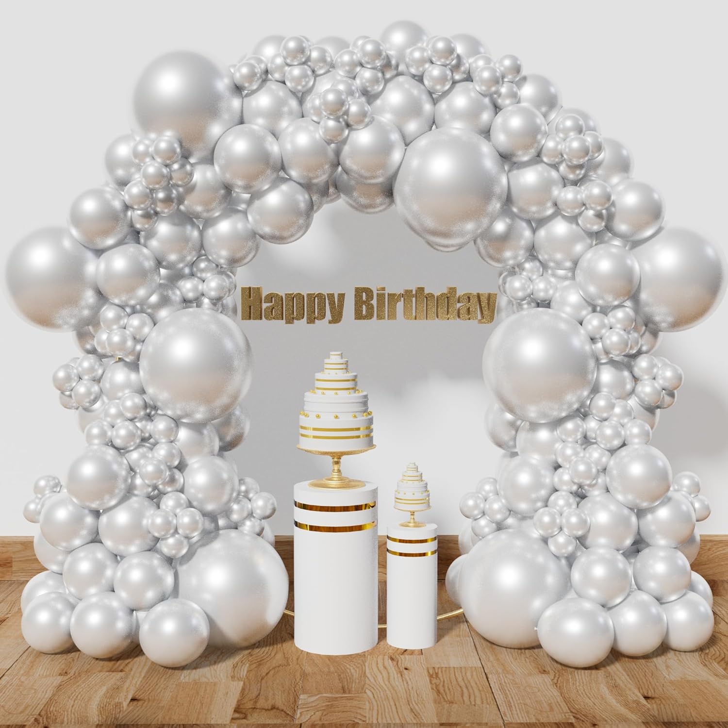 - Pearl White balloon garland kit: 111Pcs Pearl White balloons pack, including 8 pcs 18 inch balloons, 50 pcs 12 inch balloons, 50 pcs 5 inch balloons, a 5 meter balloon chain, 100 dots of glue dots, a roll of ribbon.