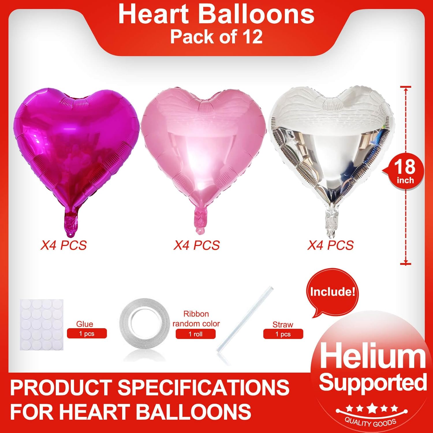 - Package Included:12Pcs (Pink*4+Silver*4+Hot Pink*4)18 inch Heart Balloons (uninflated) + 1pcs Straw +1pcs 32 foot Ribbon Roll+20 Dots Glue