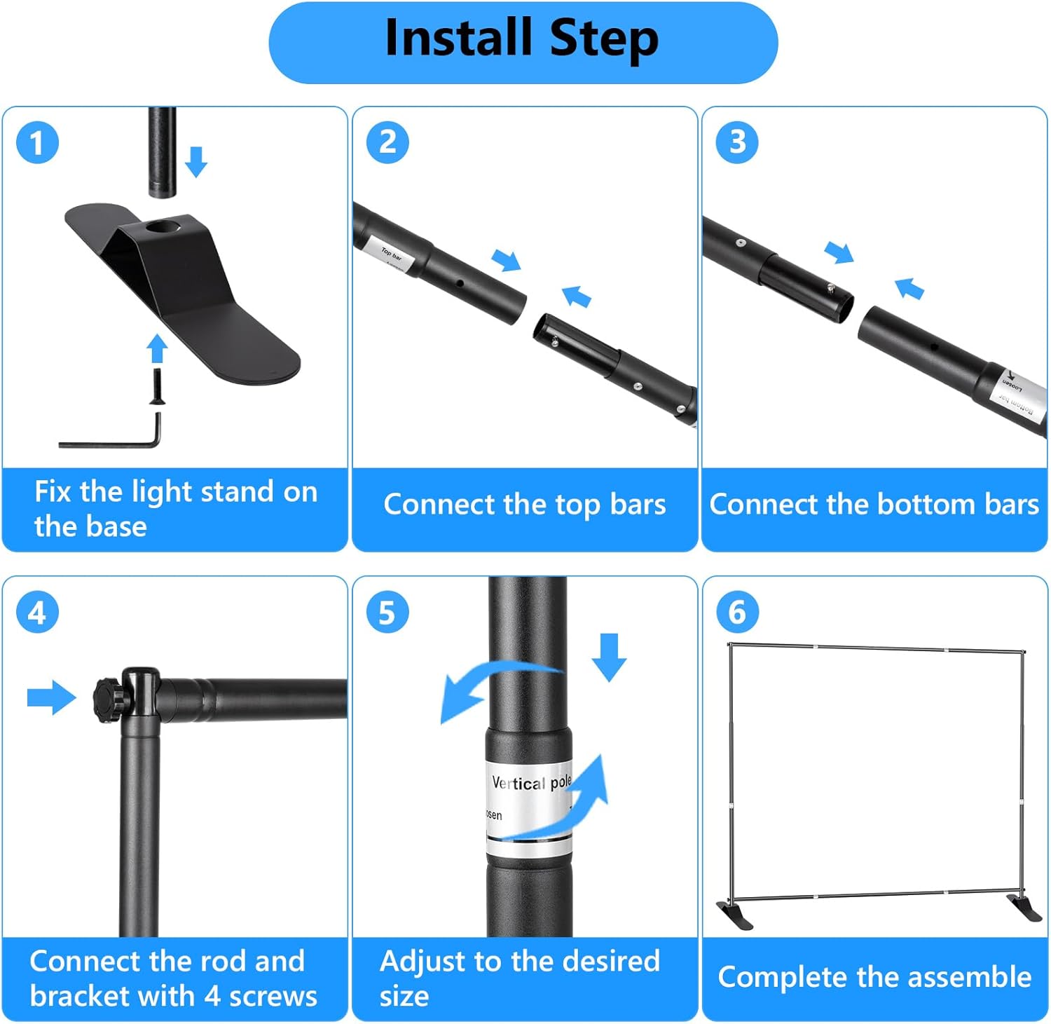 - The kit Package Include: (2) x Heavy Duty Base (2) x 10ft Adjustable Vertical Tube(2) x 5ft Top Crossbar (2) x 5ft Bottom Crossbar (4) x Long Screws(3) x Short Screws (1) x Hex Key Wrench (4) x Photo Spring Clamp/ (4) x Background Multifunctional Clips Holder (2) x wing nut (1) x Carry Bag.