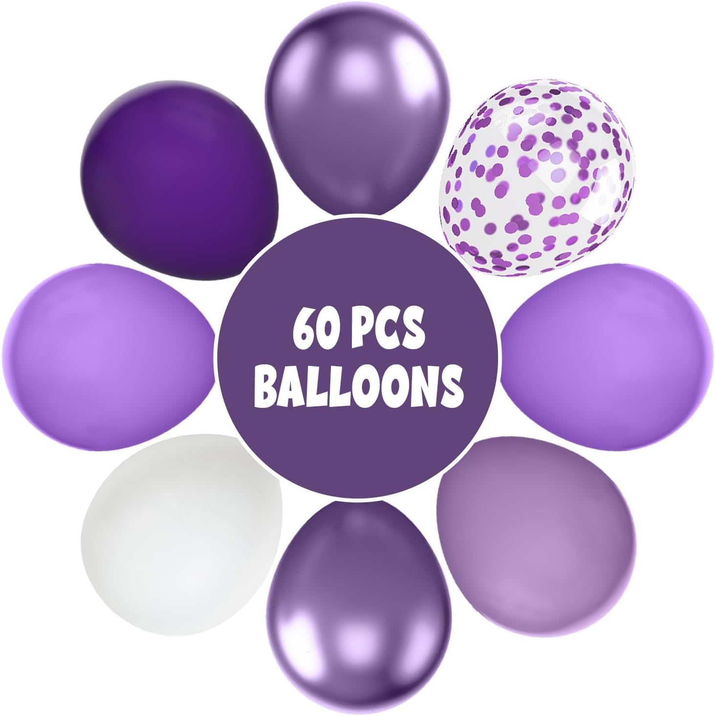 - Package Included : Our 12 inch purple balloons set includes: 16 pcs purple balloons, 12 pcs taro purple balloons, 12 pcs white balloons, 8 pcs dark purple balloons, 6 pcs metallic purple balloons, 6 pcs purple confetti balloons, 2 pcs ribbons