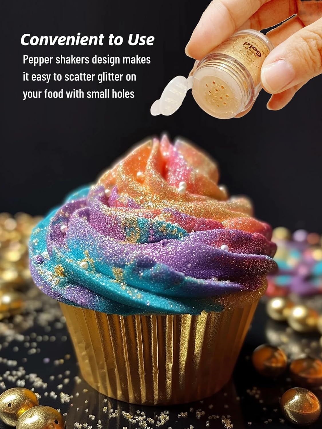 - 【Ideal Cake Decorating Supplies Glitter and Multi Using】Edible prism powder is food-grade shimmer disco edible glitter is approved for both food and drink consumption,so is great to use for drinks, beverages, cocktails, and suitable for fondant, cakes pop , cookies, cupcakes, cake decorating, macaron, icing cream, and other gourmet baked goods, glossy glitter cake topper for desserts, metal finish, chocolate, strawberries, pull candy/isomaltose, etc.,