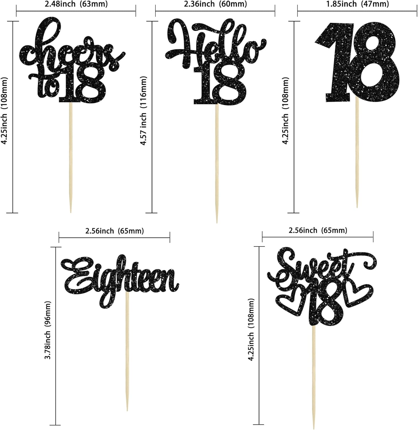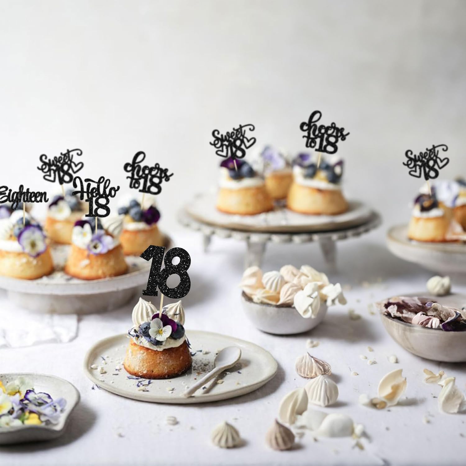 30Pcs18th Birthday Cupcake Toppers Eighteen Happy 18th Cupcake Picks Sweet 18 Cheers to 18 Cake Decorations for 18th Birthday Anniversary Party Supplies Black Glitter