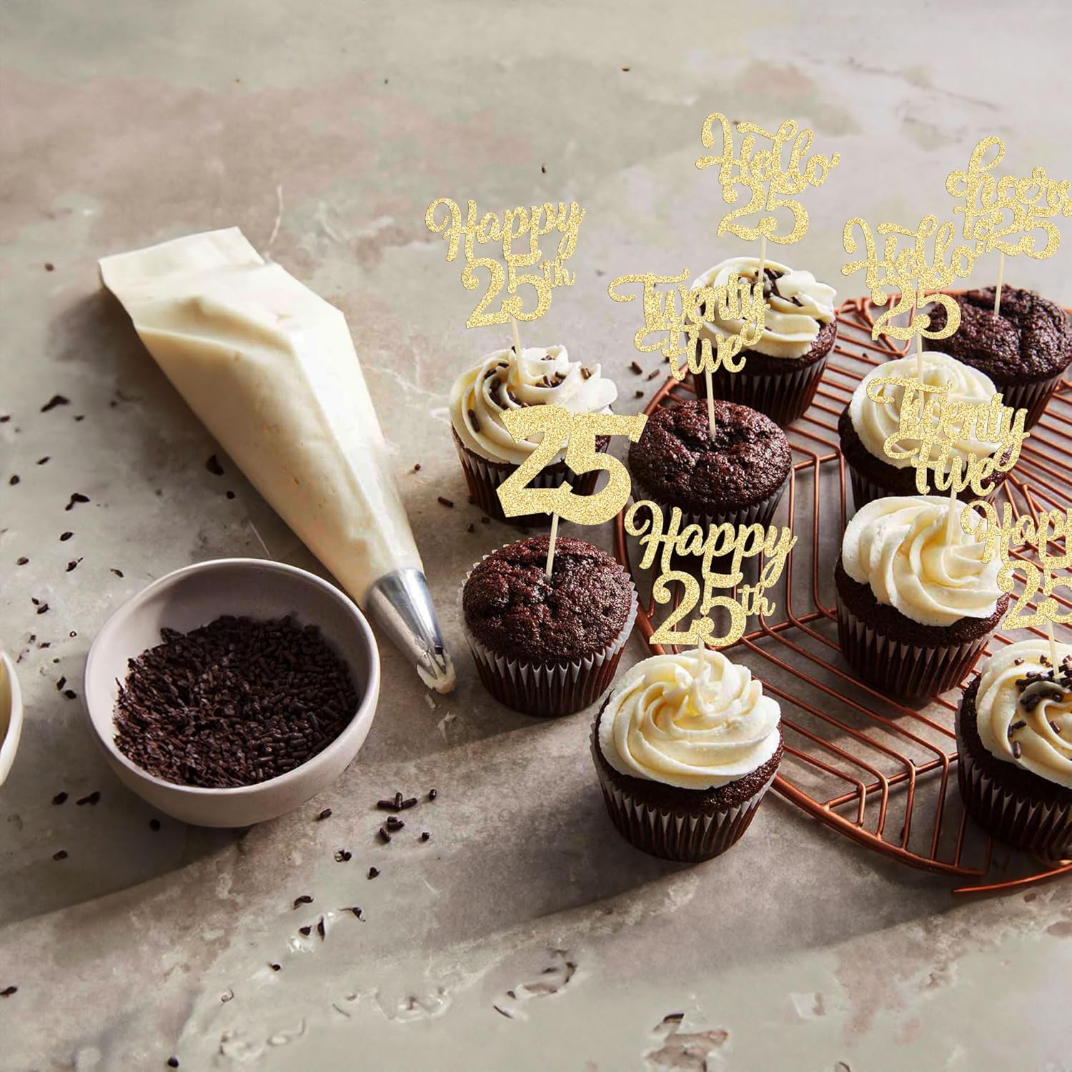 30pcs 25th Birthday Cupcake Toppers - 25th Anniversary Cake Decorations with Gold Glitter