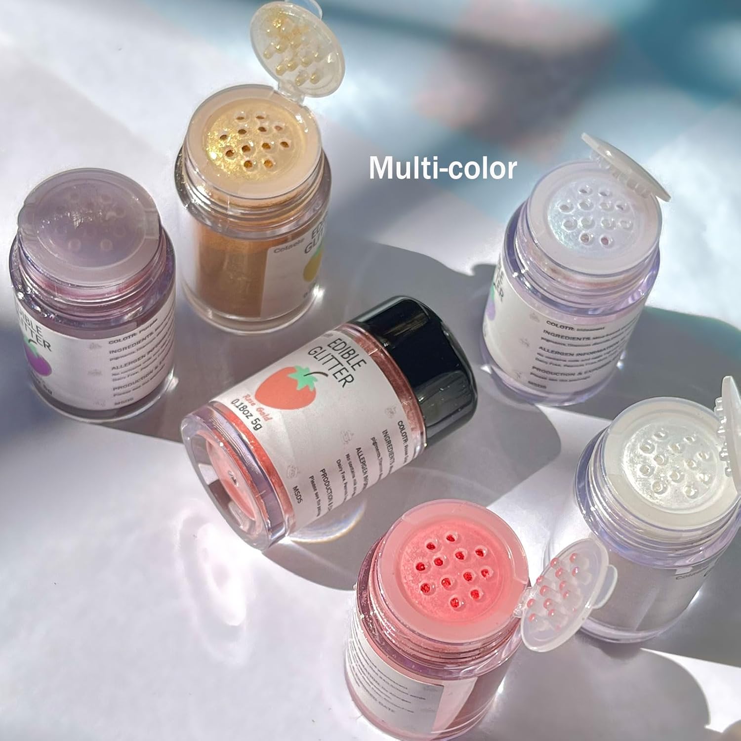 - 6 Edible Glitter Dust Colors Are Available - Includes: Iridescent Prism Powder, Rose gold, Gold, Pink, Clear white diamond, Purple, 5 Grams Each Jar. It is an ideal choice set for Halloween, Christmas, Wedding, and more holidays to decor.