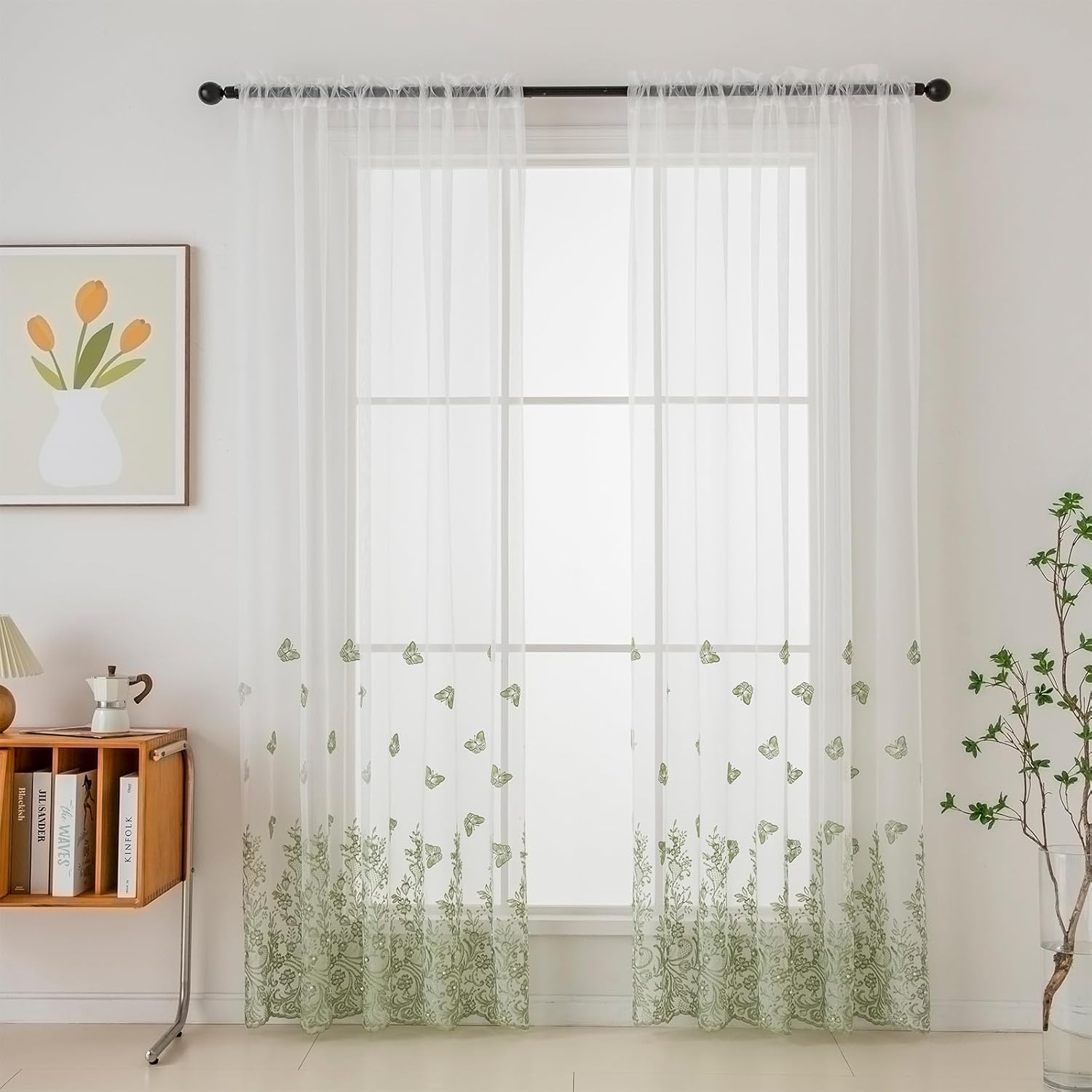 VISIONTEX White Sheer Voile Curtains, Decorative Green Embossed Butterflies Rod Pocket Window Drapes for Home Kitchen, Living Room and Bedroom 54 x 84 Inch, Set of 2 Curtain Panels