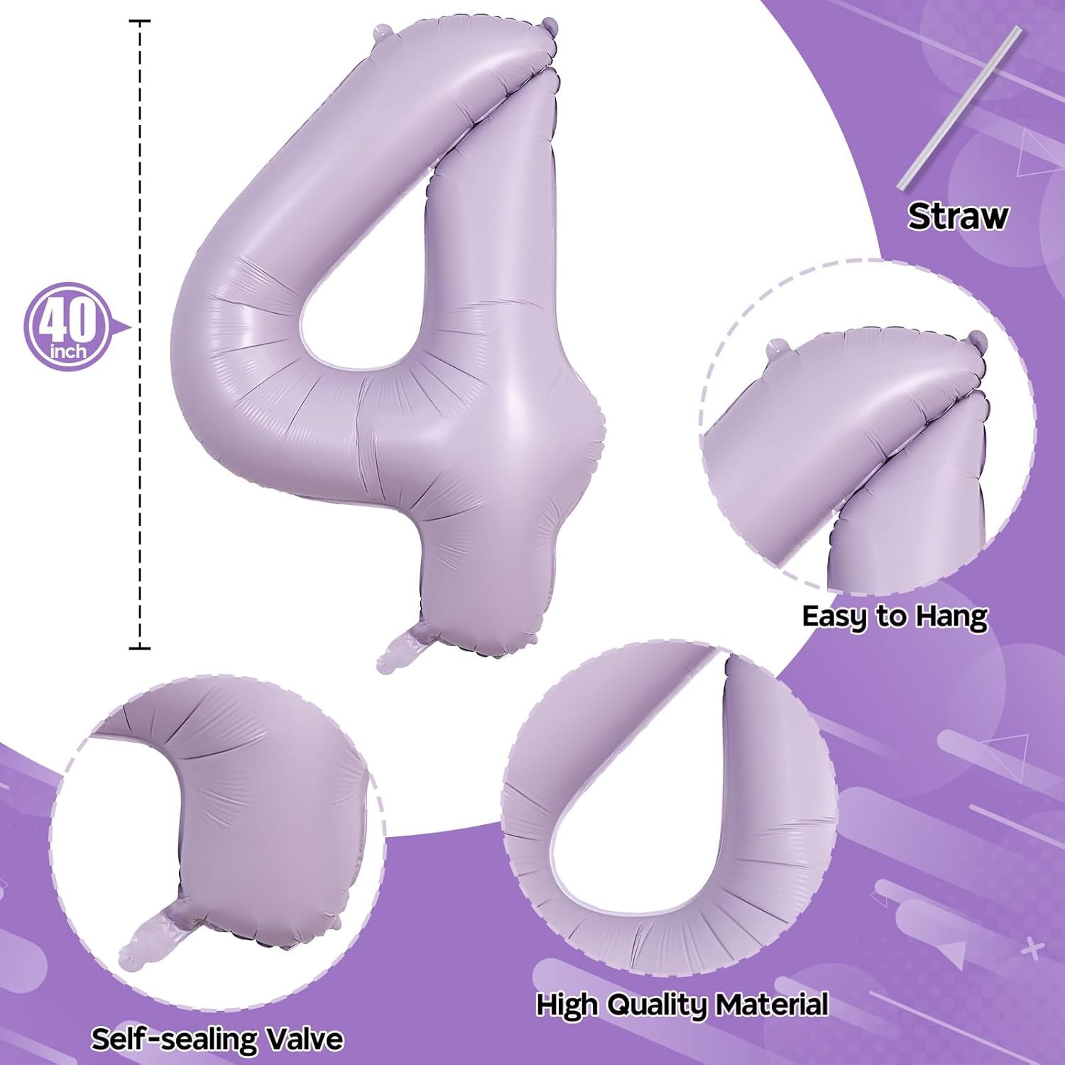 - š Pastel Purple Number 4 Balloon š - You will get 1pc 40 inch light purple mylar foil number 4 balloon and 1pc straw. Perfect for 4th 14th 40th birthday or anniversary party decorations supplies.