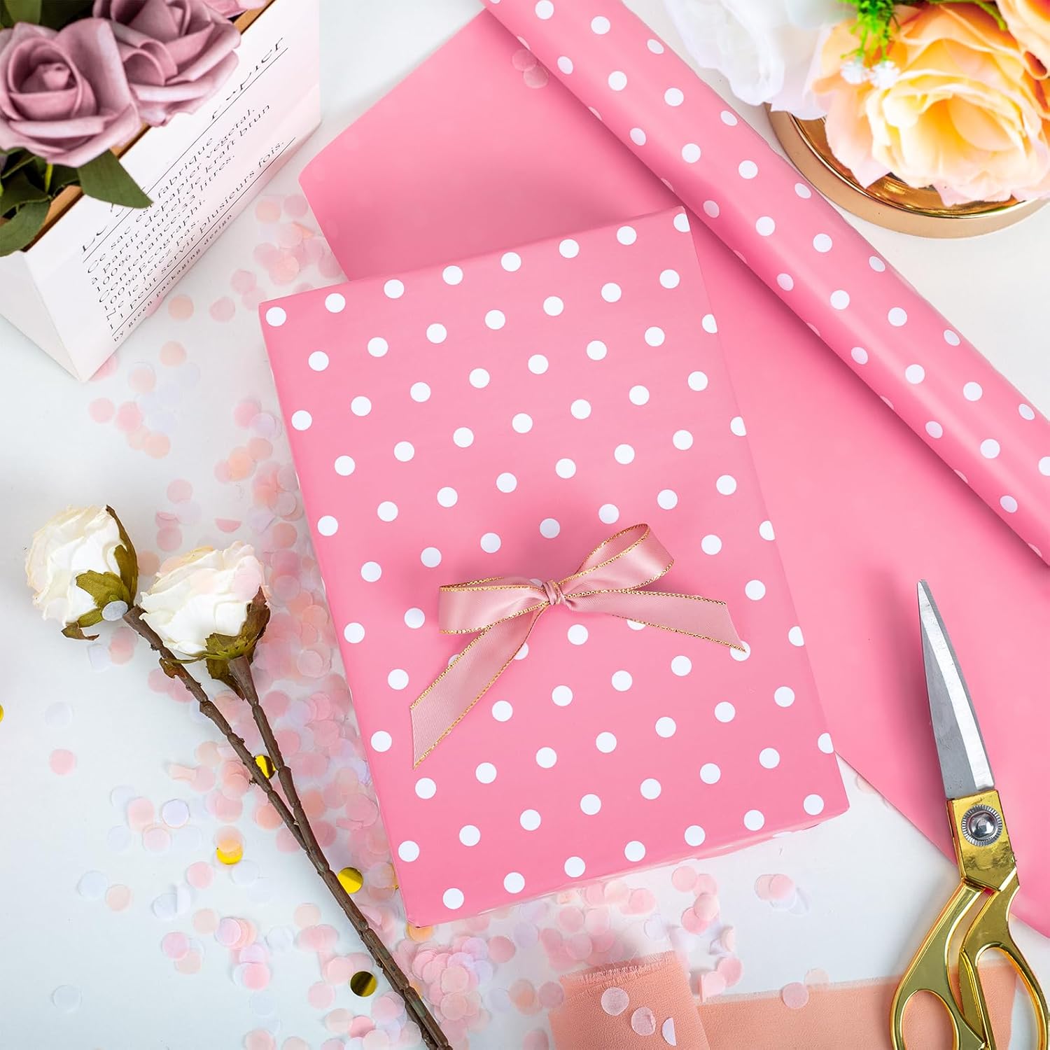 Flyhill Pink Wrapping Paper Roll,Reversible Gift Wrap Paper with Polka Dot Design for Girls,Birthday,Wedding,Baby Shower,All Holidays(17 Inch X 32.8 Feet)