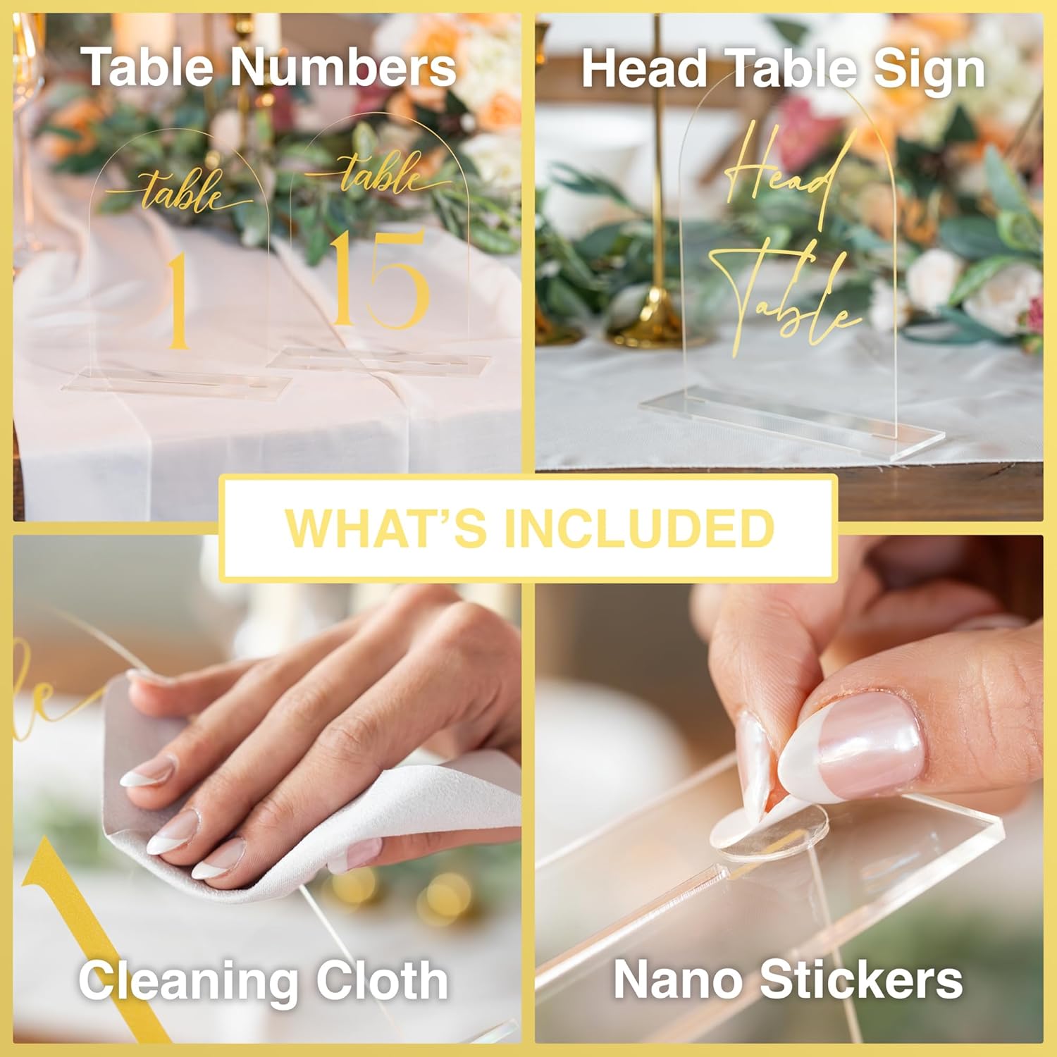 Clear Arch Acrylic Table Numbers for Wedding Reception - 5" x 7" Gold Font Centerpiece Set with Holder Stands & Head Table Sign - Anniversary, Event, Party, Wedding 1-15