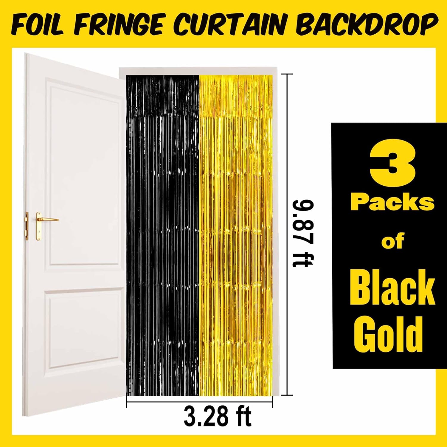 - Package and size: 3 Packs Foil Fringe Streamers Curtain Backdrop. The size is 3.28 x 9.8 feet. It's long, enough to fit any party occasion. Made of metallic foil material, shiny and creating dazzling effects, adding luxury and visual impact to the party