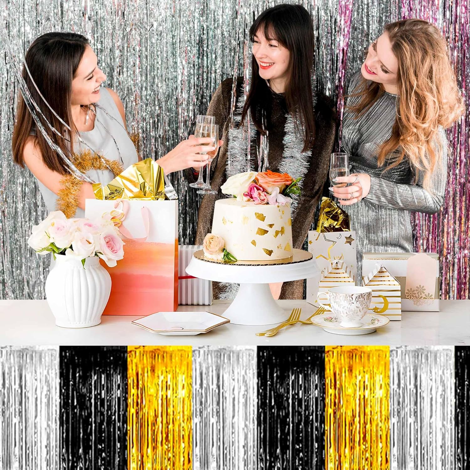 - Wide Application: Metallic tinsel foil fringe table skirts ideal for various themed party decorations, such as hotel banquet, parade float, hollywood party, homecoming, christmas, birthday, halloween, new year eve, bachelorette, engagement, anniversary, bridal shower, baby showers, graduations and more. They are also suitable for photo booth backdrops, bar, stage background, disco, etc