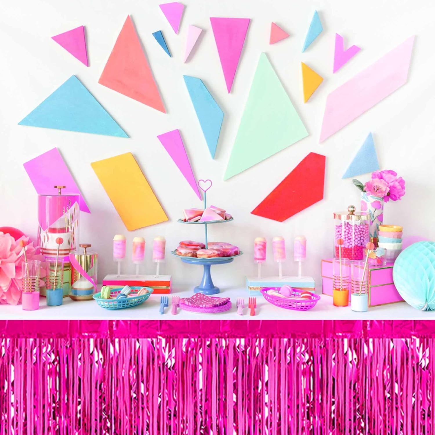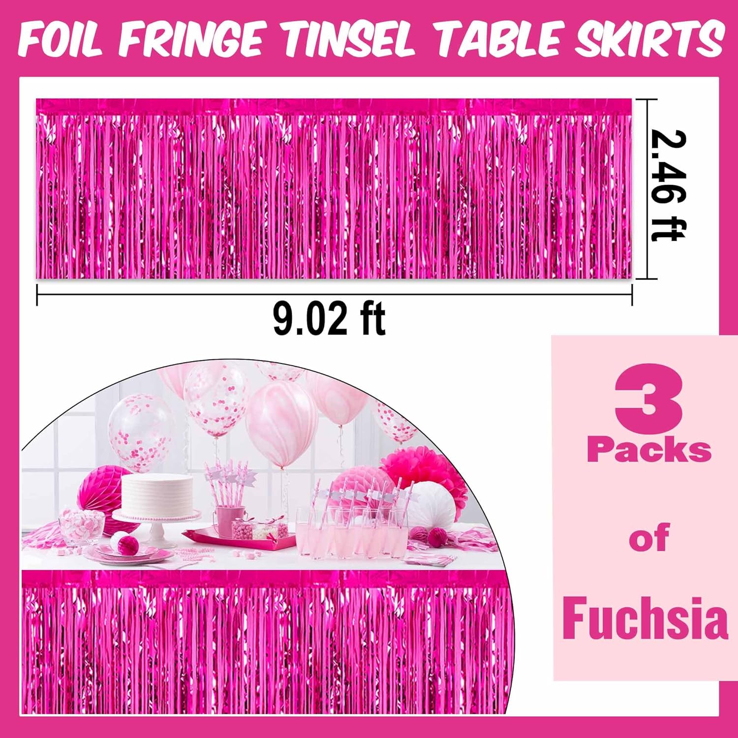 3 Pack Fuchsia Foil Fringe Table Skirts Metallic Tinsel Streamers Garland Banner Backdrop for Table Decor, Parade Float, Birthday, Wedding, Halloween, Christmas Party Decorations(29x108 In)