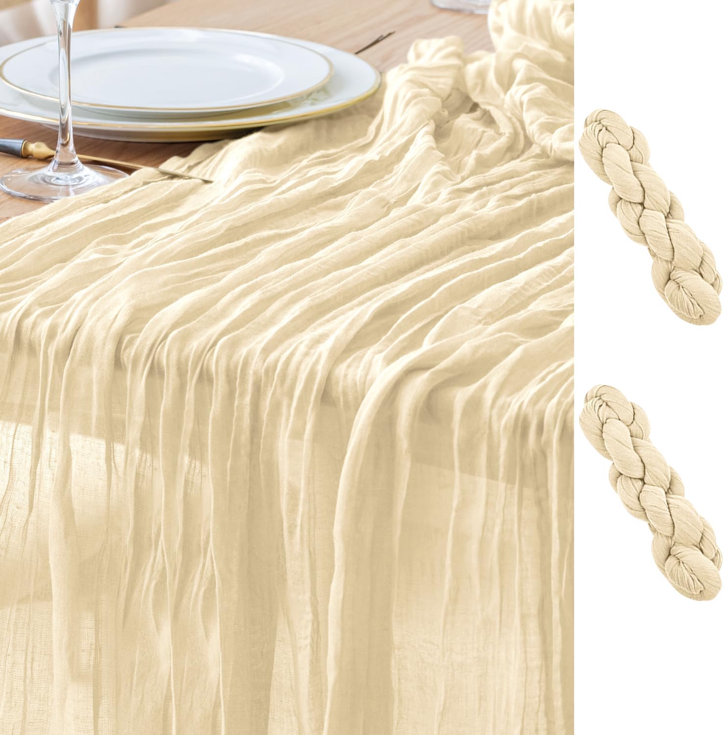 - 【Cheesecloth Table Runner】 Size: 35" W x 120" L. You will get 2 pieces 10FT length cheesecloth table runner. The sheer rustic table runner is long enough to span a large table and drape gracefully across the table. It will gently sway in the wind, adding a romantic atmosphere to your occasion. These eye-catching gauze table runners are ideal for arranging an elegant, stylish tablescape.