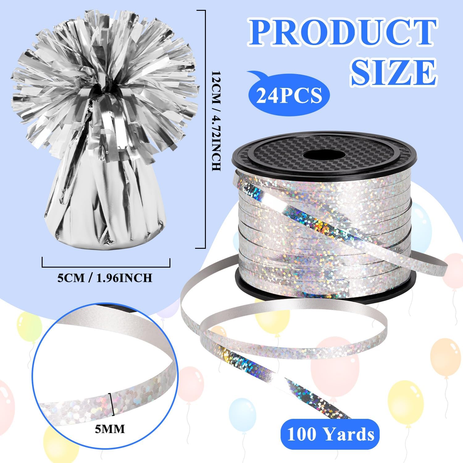 24 PCS Balloon Weights Metallic Anchor, Balloon Holder Heavy Weights with and 1 Roll Iridescent Crimped Ribbon for Balloons Table Party Favor Birthday Decor(Silver)