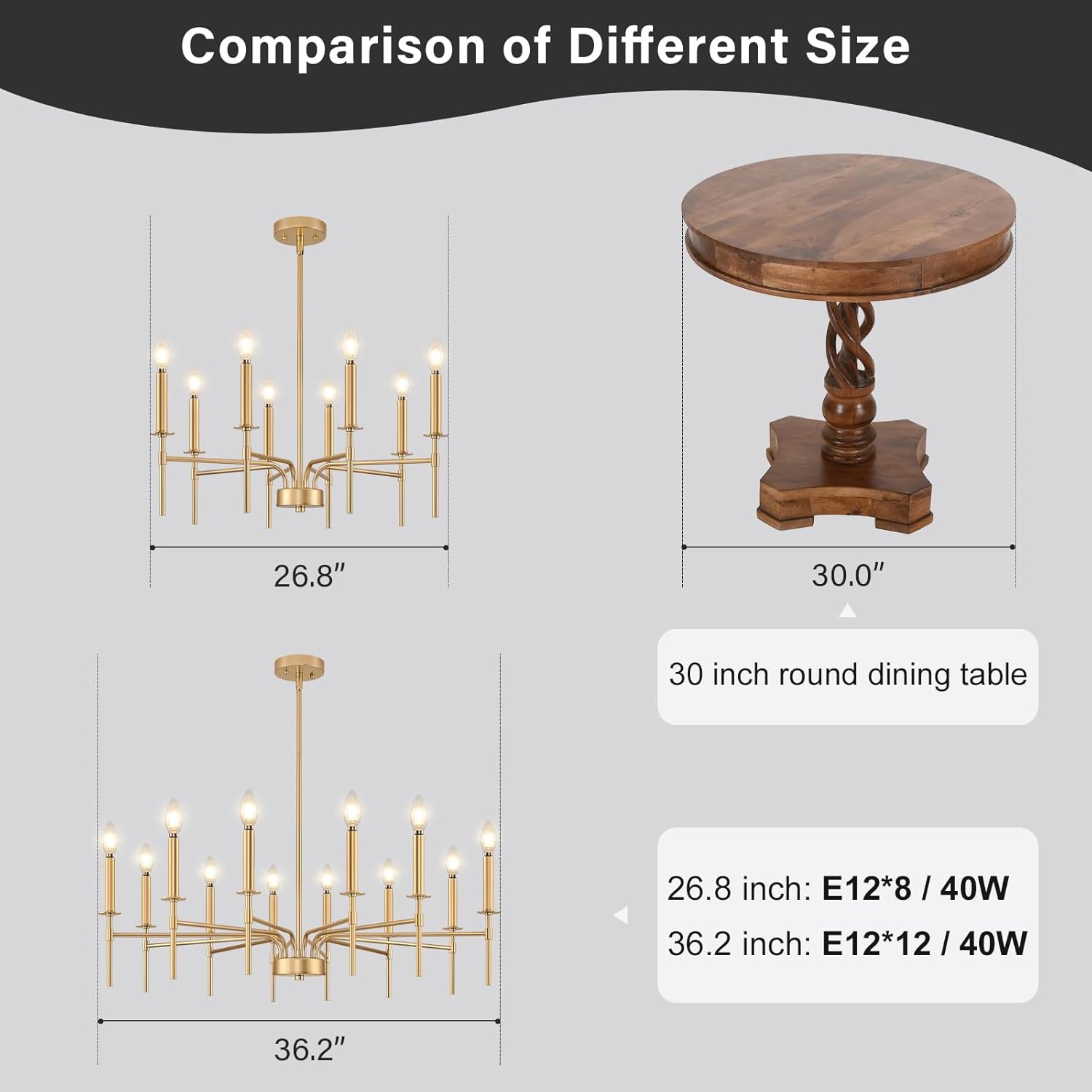 - Stylish and Widely Applicable: The 36.2-inch diameter of this large gold chandelier light fixture makes it a versatile addition to farmhouse, modern, mid-century, traditional, or contemporary spaces. It's an excellent choice for a foyer chandelier, a modern chandelier for foyer entryway, or as a statement piece in a gold dining room chandelier setting, and also ideal for a living room chandelier