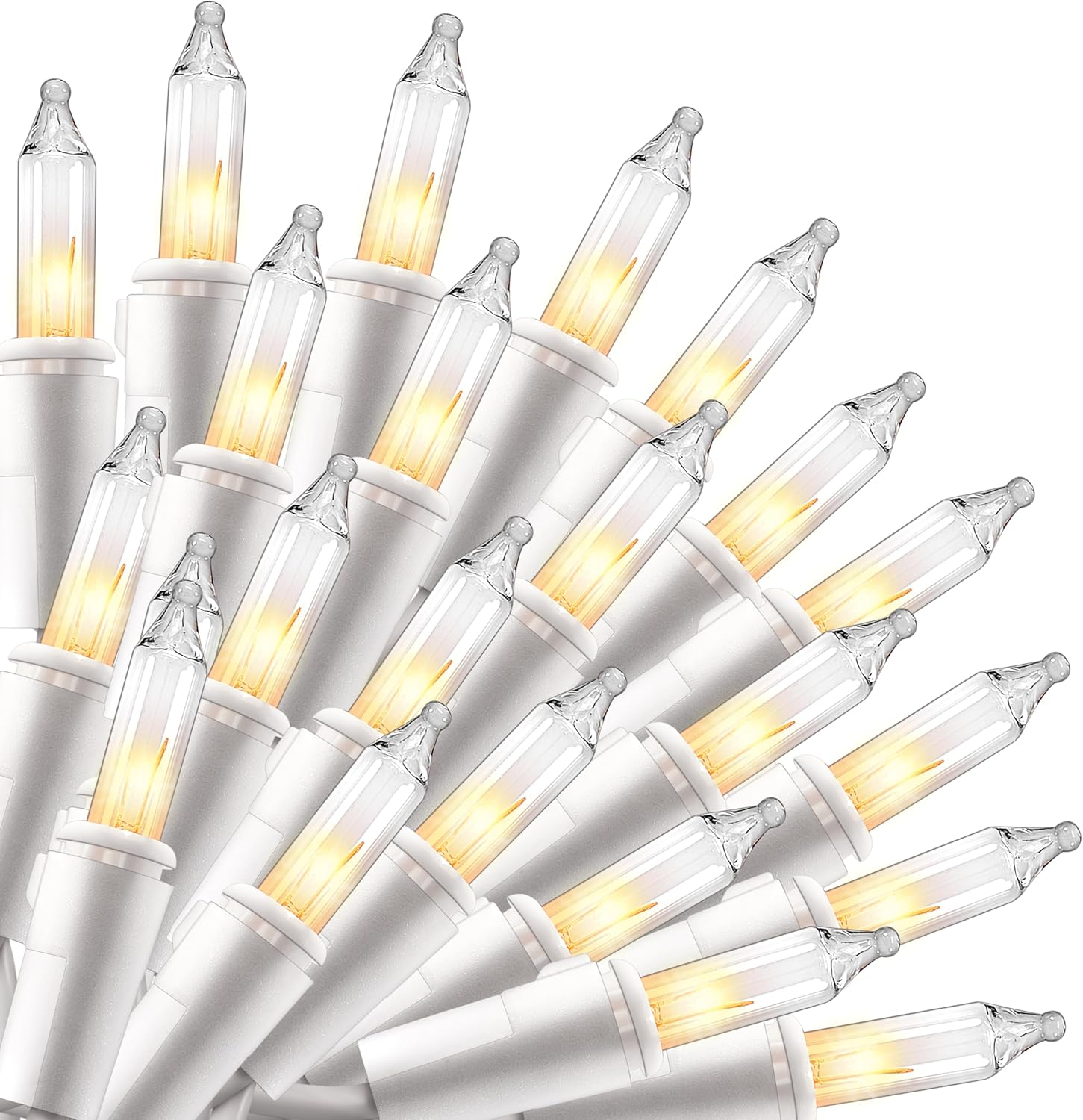 - Value 2-Pack: Each set includes 100 warm white T5 bulbs with 21.4ft cords.200 warm white T5 bulbs with 42.8ft white cords provide 38.8ft of lighting length and 2.36 inch spacing for a brilliant light effect. These high-voltage Christmas lights provide dense, vibrant illumination, perfect for decorating your tree, roof, or mantelpiece for a classic holiday look.
