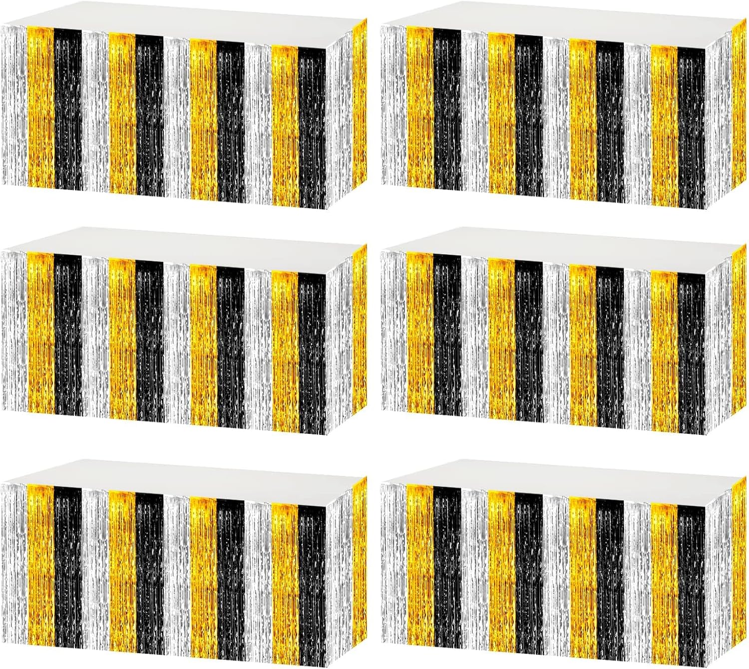 6 Pack 29x108 Inch Metallic Foil Fringe Tinsel Table Skirts Banner for Rectangle Tables Streamer Garland for Birthday, Parade Floats, Valentine's Day Party Decoration(Black Gold Silver)