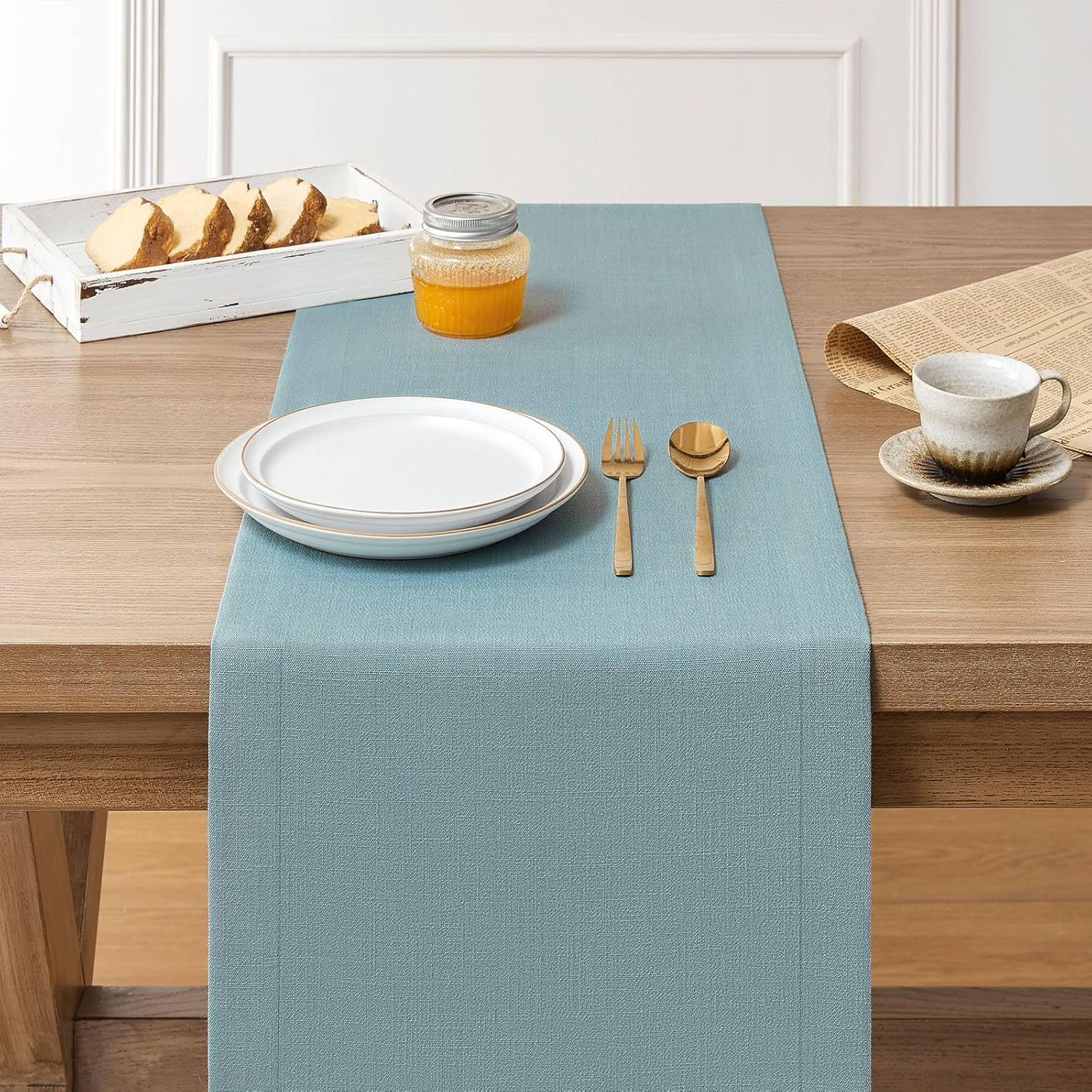 ZeeMart Linen Textured Border Table Runner, 14 x 108 Inch Blue, Farmhouse Style Dusty Blue Table Runners 108 Inches Long, Easy Care Everyday Polyester Table Runner
