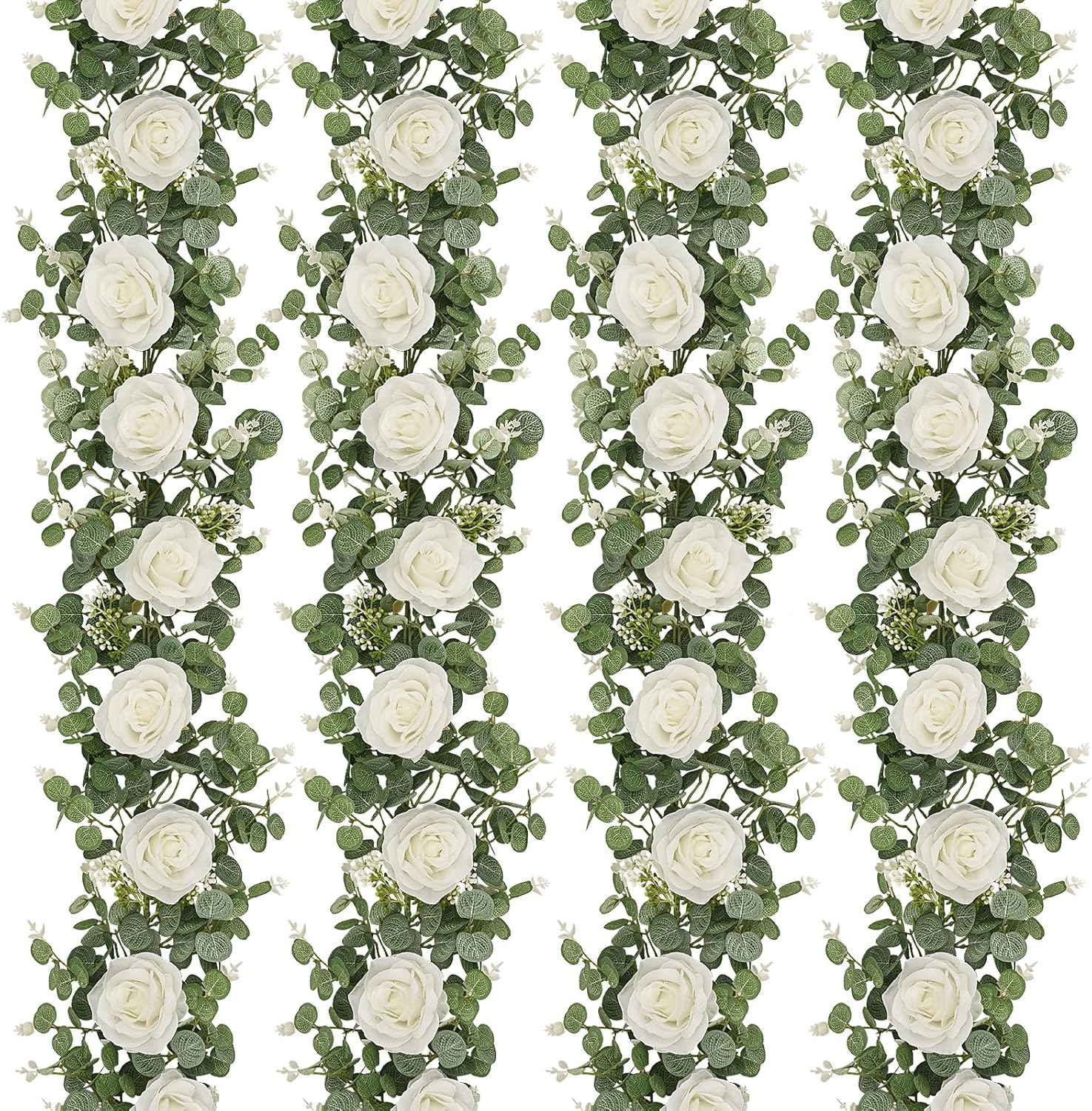 Dolicer 4Pcs 26Ft Artificial Eucalyptus Garlands with Flowers - 8 Roses, Faux Floral Greenery Garlands Fake Flowers Vines for Wedding Table Centerpieces Arch Party Ceremony Backdrop Decor (White)