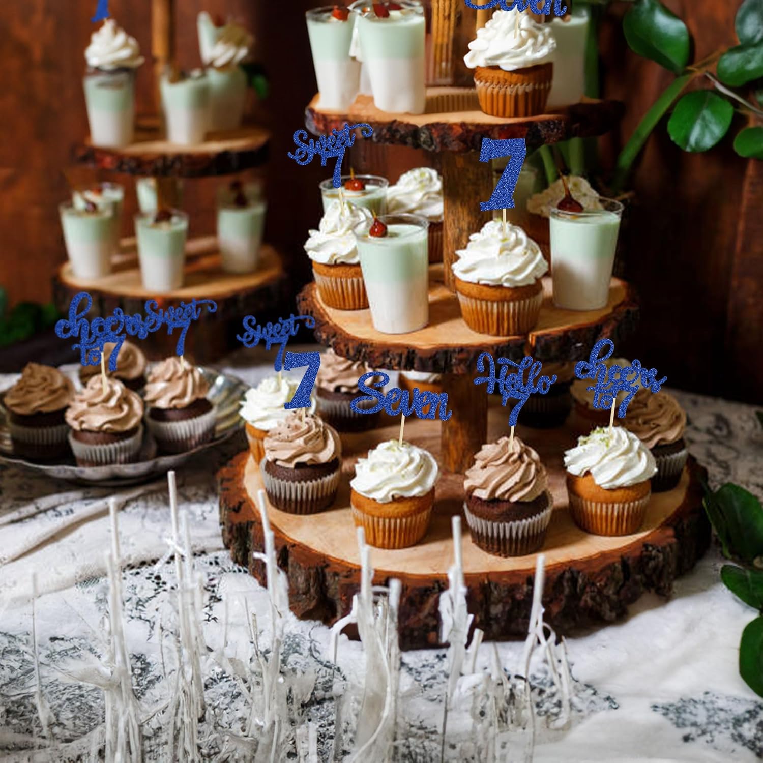 30Pcs 7th Birthday Cupcake Toppers Glitter Seven Happy 7 Cupcake Picks Cheers to 7 Years Old Cake Decorations for 7th Birthday Party Supplies Deep Blue